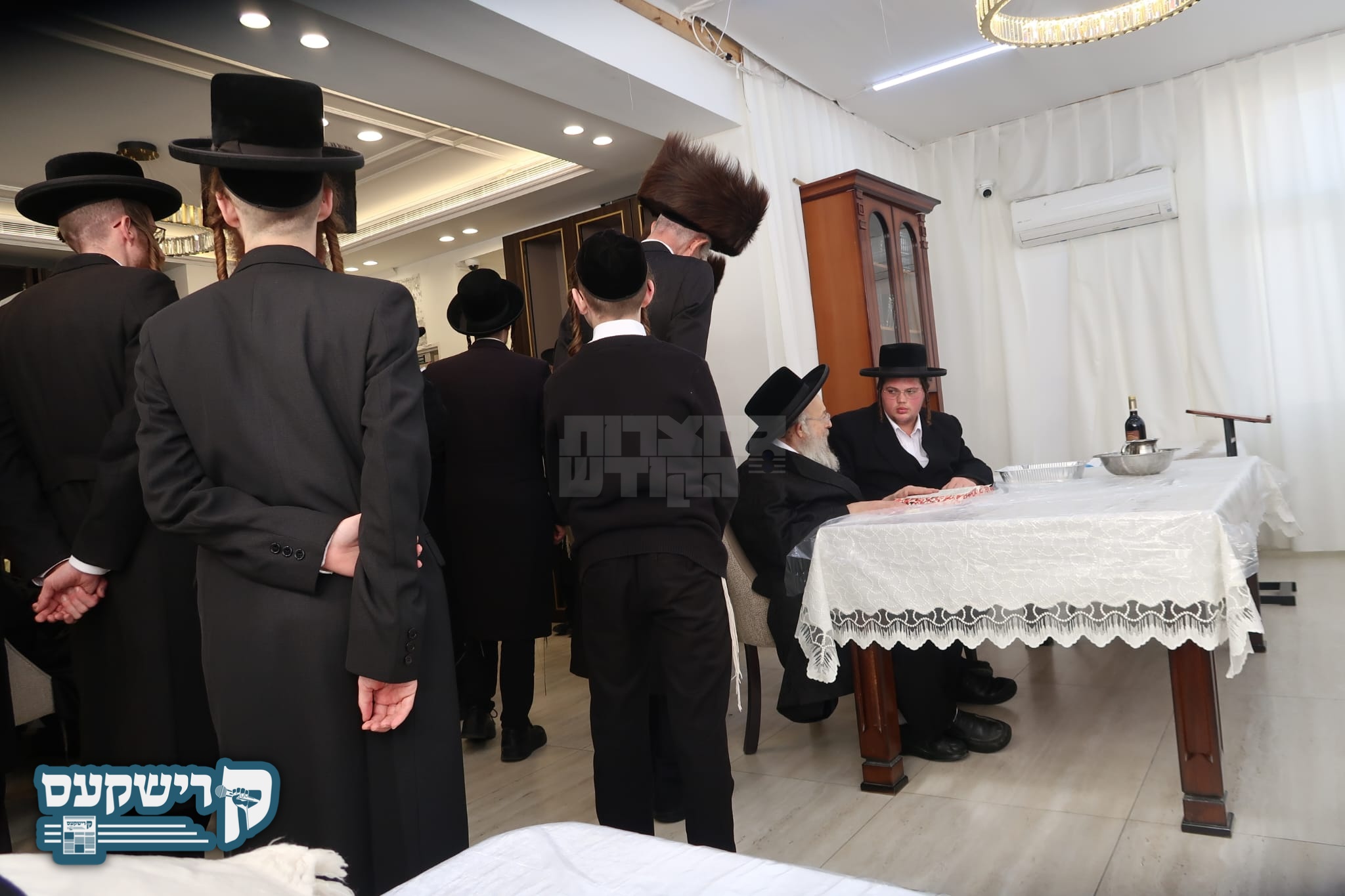 שיין בילד פון האדמו"ר מבית יצחק ספינקא ביים מקבל פנים זיין מחותנו האדמו"ר מראחוב פון ארה"ק אינעם קענעדי לופטפעלד אנקומען צום חתונה בבית ספינקא – ראחוב.