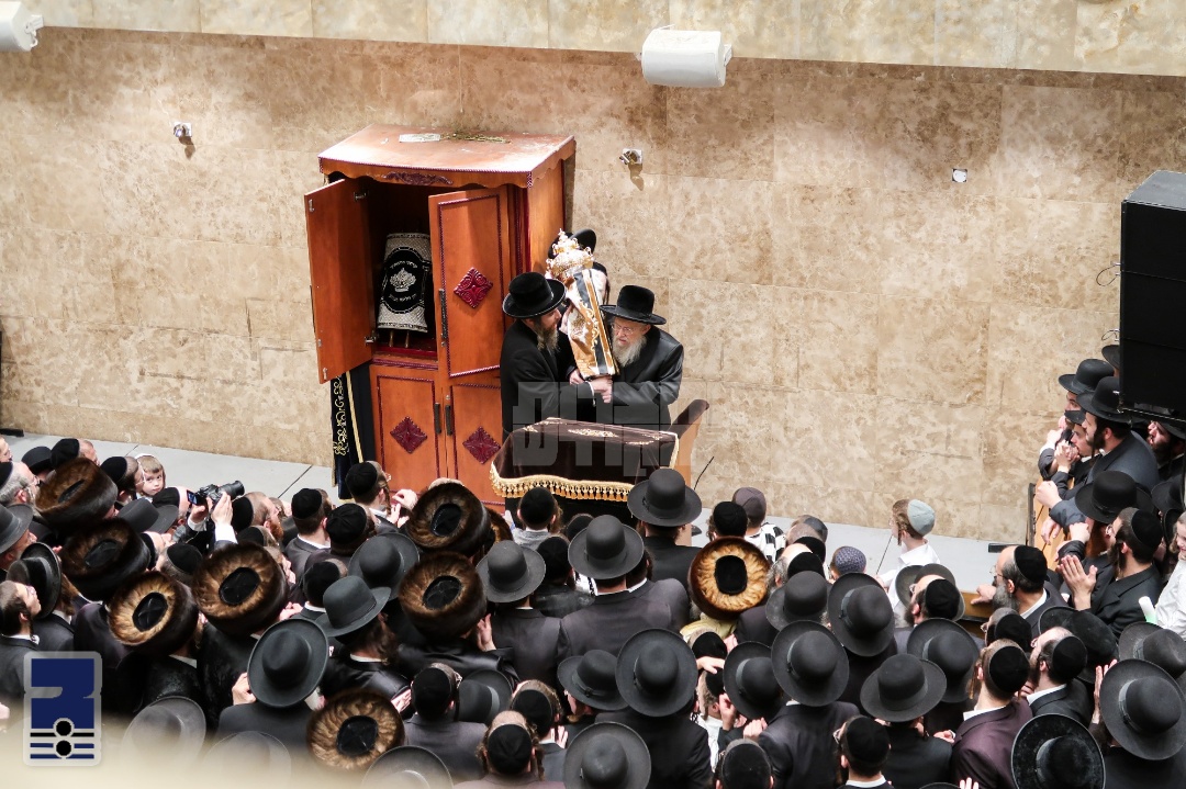 די תהלוכה לכבודה של תורה איז ארויס פון זיין הויז אין ירושלים אויפן וועג צום ביהמ"ד הגדול סלונים אין ירושלים, ווי כ"ק אדמו"ר מסלונים שליט"א האט באשיינט די מעמד אין ביהמ"ד און האט אפגעראכטן די הייליגע ריקודין מיט די ספר תורה בעוז ותעצומות, פארגעזאגט די מזמורים און אריינגעפירט דעם ספר תורה צום ארון קודש. עס האט נאכגעפאלגט מיט די סעודה לגומרה של תורה אינעם זאל פון בנין בית מדרש הגדול, בהשתתפות הרבנים הגאונים הצדיקים קינדער פונעם רבי'ן שליט"א, ווי מען אט במשך די סעודה מעלה געווען זכרה פון די שאצער רעבעצין און אירע הייליגע אבות זכותם יגן עלינו.
