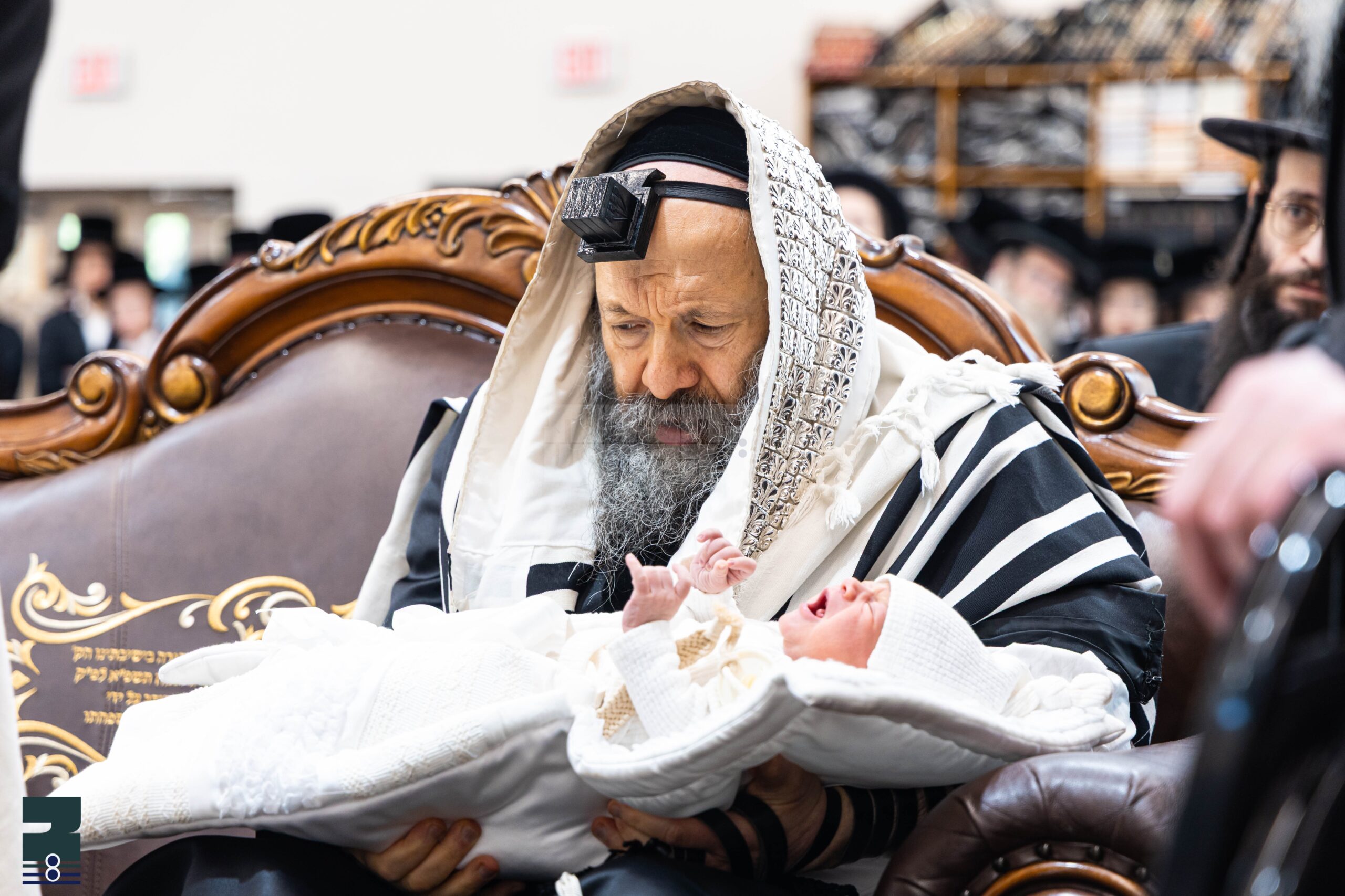 דער רבי שליט"א איז מכובד געווארן מיט סנדקאות, מיט ברכות איז מכובד געווארן די זיידע הגה"צ אבד"ק נאסויד שליט"א, קריאת השם די זיידע הגה"צ אבד"ק ציעשנוב שליט"א, עמידה לברכות די פעטער הגה"צ אבד"ק באבוב 45 שליט"א.