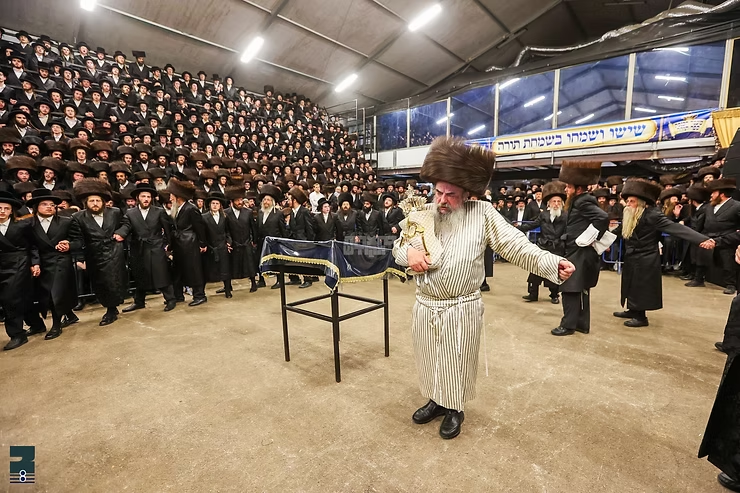 די ריקודין האבן פארגעזעצט ביתר שאת ועוז אינעם גרויסן שאטער פארנט פון ביהמ"ד וואס איז געווען אויסגעשטאט מיט הויעך שטאקיגע פארענטשעס איבערגעפילט מיט די הונדערטער אברכים ובחורי חמד, ווען די רבי שליט"א האט אפגעראכטן די הקפות מיטן ספר תורה מיט אן התלהבות דקדושה. דערנאך האט די רבי מכבד געווען אחיו כ"ק אדמו"ר הרה"צ רבי יעקב יצחק בידערמאן שליט"א מלעלוב ירושלים און גיסו הרה"צ רבי ישראל ארנסטר שליט"א טאנצן מיט די ספר תורה, דערנאך איז געשאפן געווארן א מחול פון די בני משפחת המלוכה, צאצאים פון די רעבעצין ע"ה, ווען אינדערמיט זענען די אייניקלעך הרבנים שליט"א און די חשובי וזקני העדה געטאנצן מיט די ספר תורה בעת די רבי איז מעודד די ריקודין.