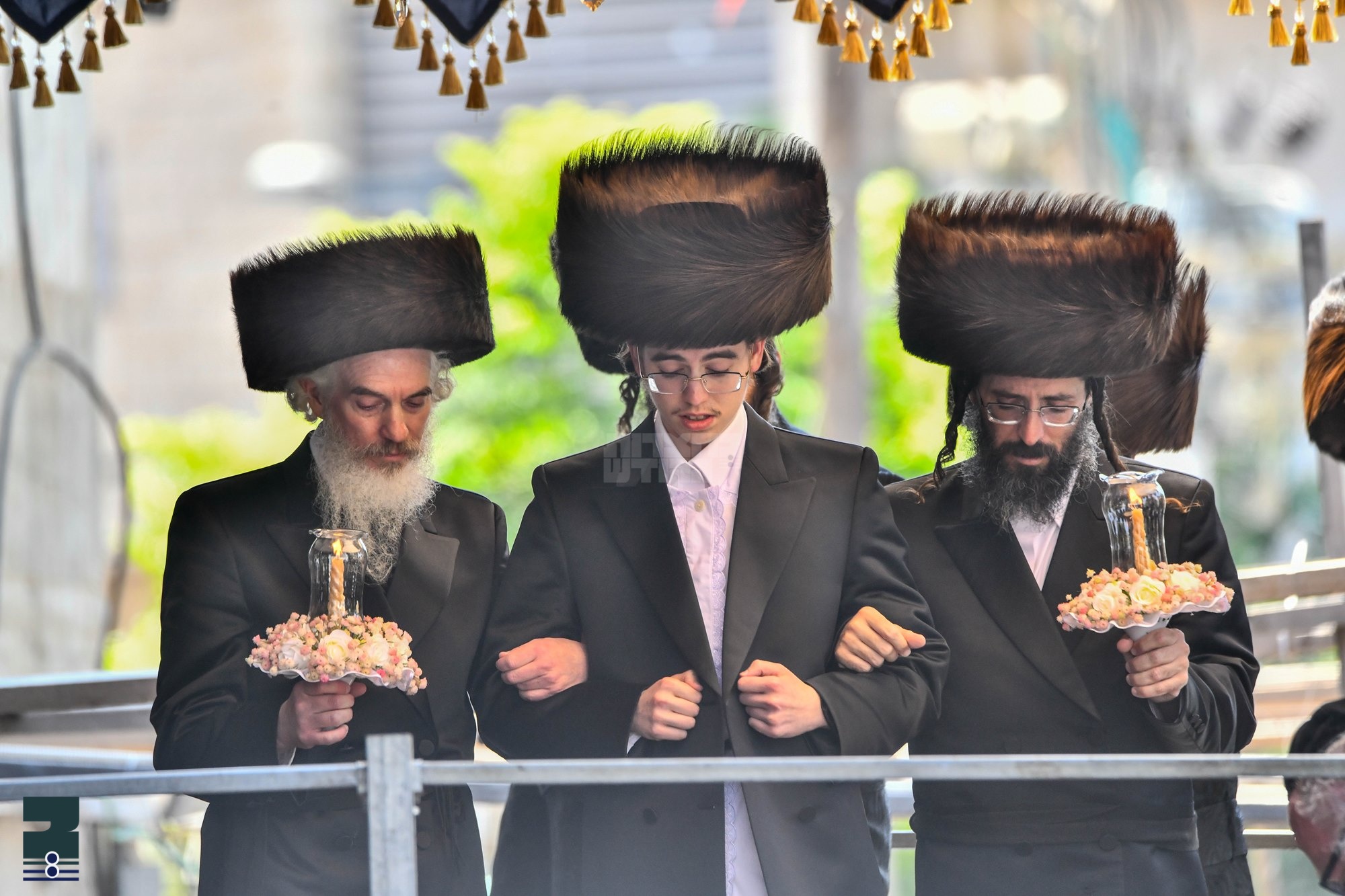 אום פינעף אזייגער נאכמיטאג האט מען – לקול תרועת הזמר – מקבל געווען את פני הקודש פון די געהויבענע זיידעס און מחותנים האדמורי"ם והרבנים שליט"א ביים ערשיינען צום סעודת החתונה, דאן איז די גאנצע ציבור אריבער וואונטשן לחיים פאר די געהויבענע זיידעס און מחותנים.