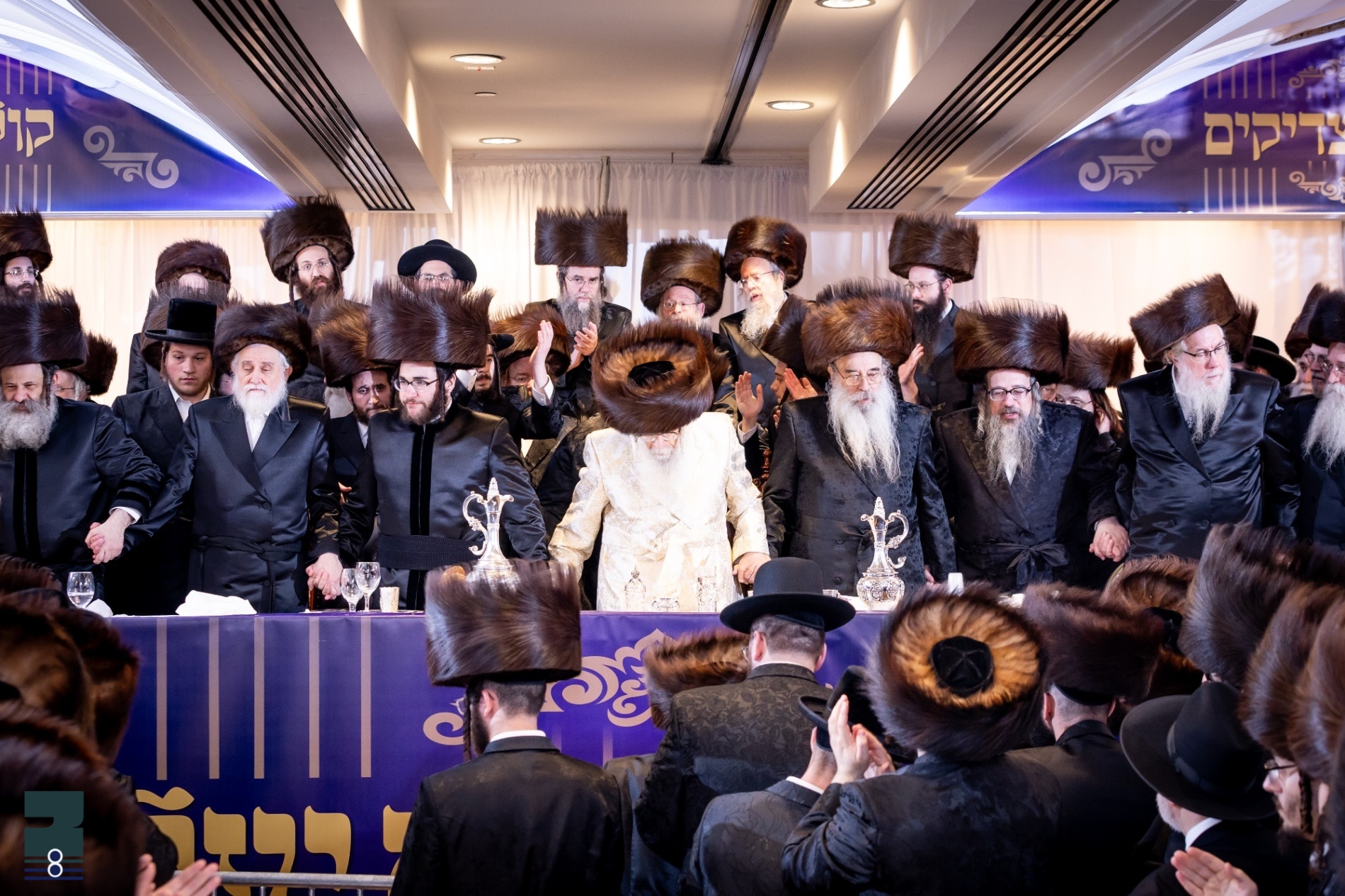 נאך עטליכע מינוט איז דער חתן אריינגעקומען, די רבי שליט"א האט געטאנצן מיטן חתן און מכבד געווען די זיידעס און מחותנים צו טאנצן, און דערנאך איז דער ציבור אריבער וואונטשן מזל טוב פארן רבי'ן שליט"א.
