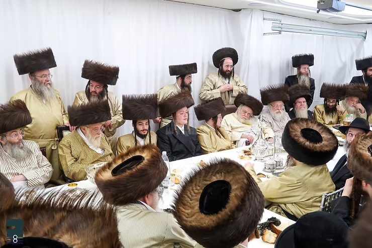 בראש השולחן זענען געזעצן די דריי חתנים ווען לימינם זיצט כ"ק אדמו"ר מתולדות אהרן שליט"א און לשמאלם כ"ק אדמו"ר מתולדות אברהם יצחק שליט"א.