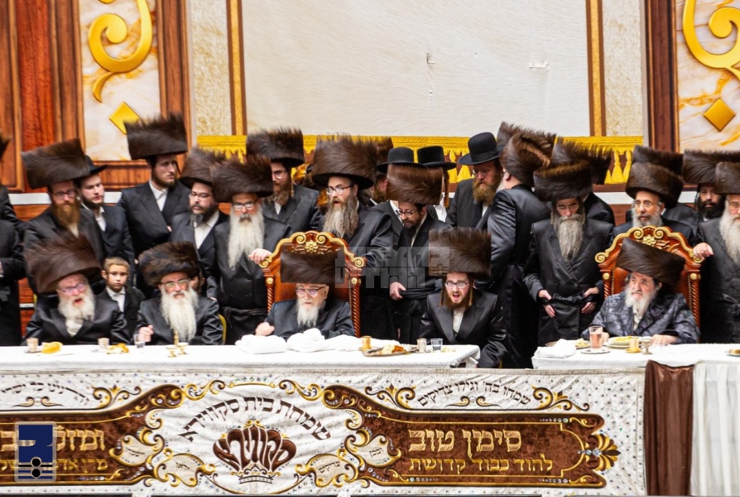 ארום זיבן דרייסיג נאכן וואונטשן די חתן כלה אין יחוד שטוב כנהוג, איז דער געהויבענער בעל שמחה כ"ק אדמו"ר מסקווירא שליט"א ערשינען אינעם פול געפאקטן ביהמ"ד לקול תרועת השמחה אינאיינעם מיטן חתן, פאר איבער א האלבע שעה האט מען געטאנצן לעבעדיג אין די צייט וואס דער רבי זעלבסט איז מעודד די ריקודין בשלהבת אש קודש. דערנאך האט זיך די רבי געוואשן צום סעודה און קורצליך דערויף איז ערשינען דער געהויבענער זיידע מרן אדמו"ר מויזניץ שליט"א, וואו מ'האט מקבל געווען פני קדשו מיטן ניגון קול רינה. די וויזניצער רבי האט זיך געוואשן, די אדמורי"ם האבן טועם געווען פון די מאכלים, שפעטער האט מען ממשיך געווען מיט לעבעדיגע ריקודין, און נאכן טאנצן איז די וויזניצער רבי ארויס אויף א הפסקה אינעם חדר הפרטי פון סקווירא רבי'ן און דער גאנצער ציבור איז אריבער וואונטשן לחיים פארן סקווירא רבי'ן און מחותנים.