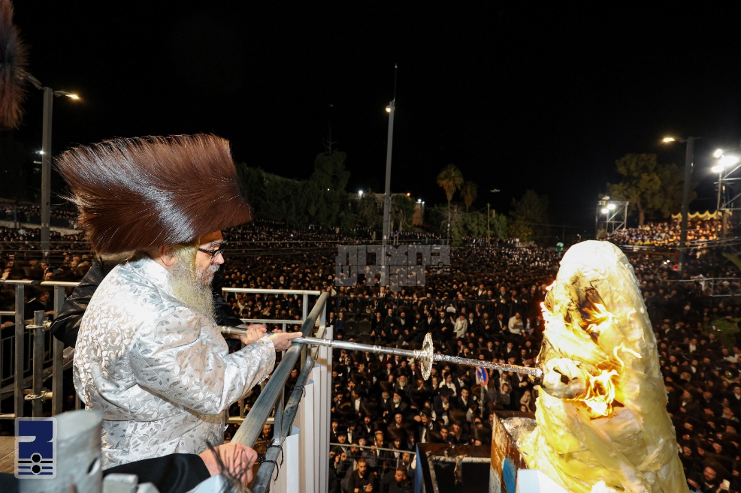 דאן האט דער רבי שליט"א איבערגענומען דעם פייער פאקל, ובדחילו ורחימו, ביראה עילאה צוגעטרעטן אנצוצינדן דעם מדורת אש. דערביי האבן די בעלי השיר ממשיך געווען מיט ניגוני התעוררות, דעם ניגון פון "גלות גלות" ארויפגעפאסט אויף די ווערטער "לכבוד התנא האלקי רבי שמעון בר יוחאי".
