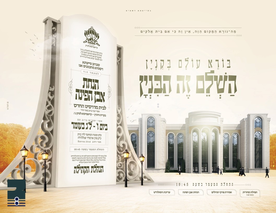 אצינד, ווען מ'גרייט זיך שוין אנהייבן גיסן די יסודות הבנין, איז באשטימט געווארן דער מעמד הנחת אבן הפנה, אויף דעם קומענדיגן ל"ג בעומר, ברוב עם הדרת מלך זקנים עם נערים אין שפיץ פונעם רבי'ן שליט"א.