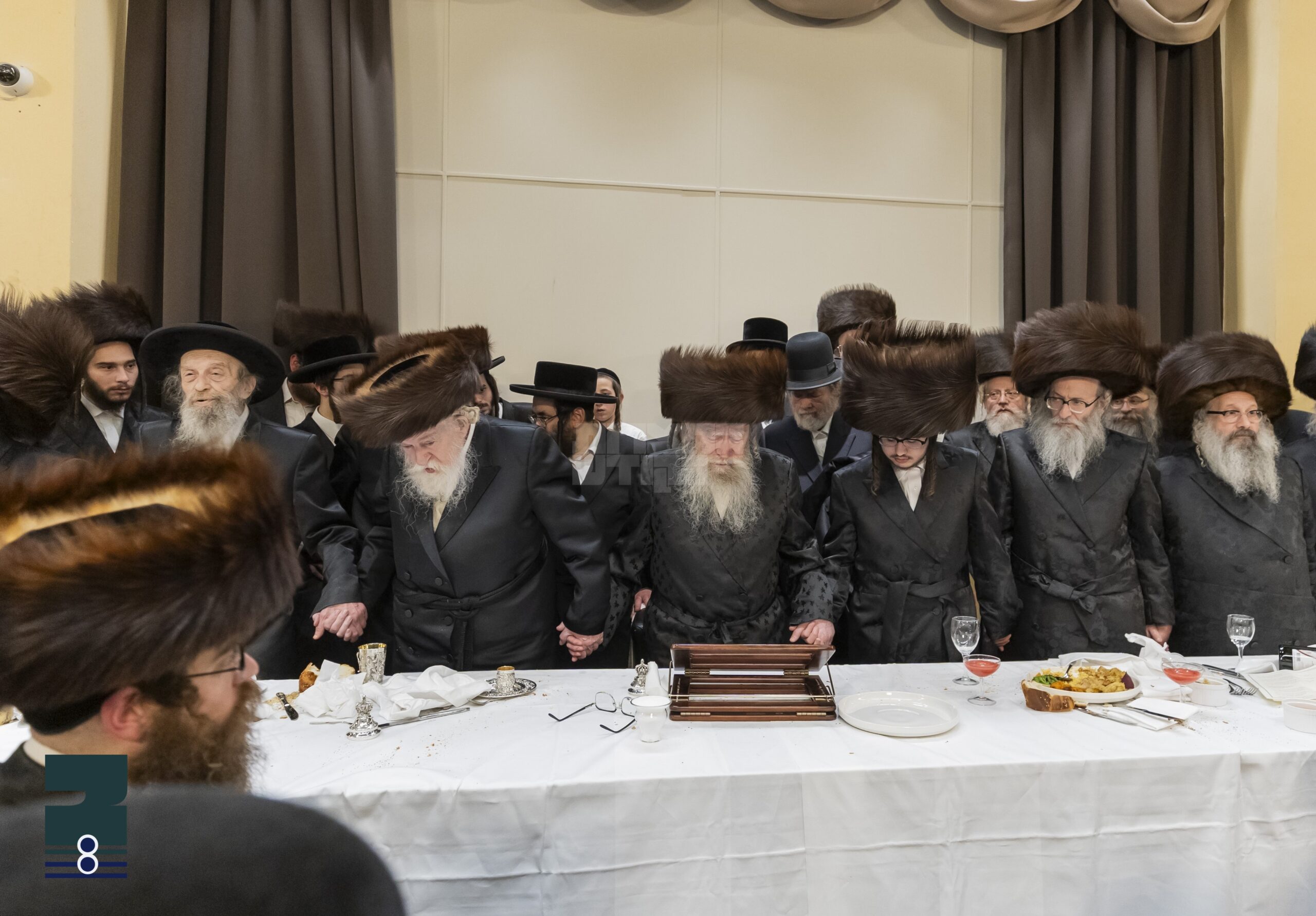 די זיידע כ"ק אדמו"ר מפשעווארסק שליט"א איז מכובד געווארן מיט ברכת המזון על הכוס, און מיט די שבע ברכות האט מען מכבד געוועהן די רבנים קרובי המשפחה, ברכה אחריתא די פעטער כ"ק אדמו"ר מספינקא אנטווערפען שליט"א. די שמחה האט זיך געשלאסן מיט א שיינעם ריקוד ווען דער רבי האט זיך אויפגעשטעלט טאנצן מיט די חתן און מחותנים אויפן אויבן אן.