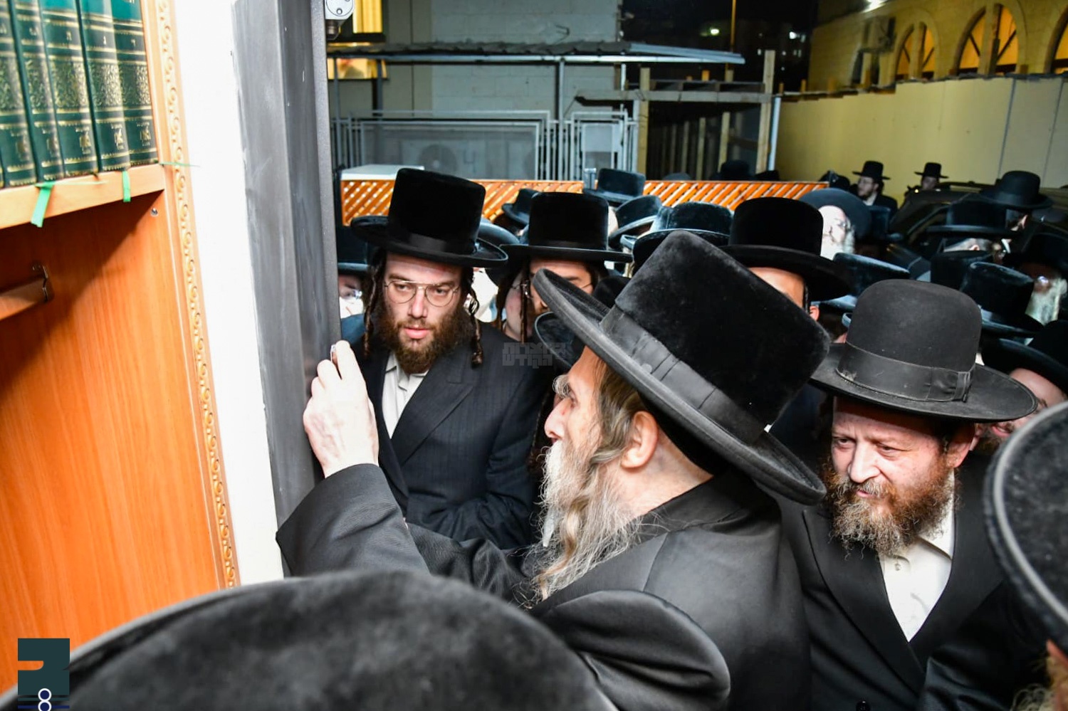 ביים אנקומען האבן די חסידים אנטפאנגען דעם רבי'ן שליט"א מיט פייערליכע גאזאנג און די ילדי החמד האבן מקבל פנים געוועהן מיט פאקלען, דער רבי האט צום ערשט קובע געווען א מזוזה ביים הויפט אריינגאנג פונעם נייעם ביהמ"ד, און דערנאך איז פארגעקומען די מעמד ביי וועלכן מען האט געזינגען ניגוני שבח והודאה, און עס האבן אויפגעטרעטן הרה"צ רבי שלום צבי סופר בנו יחידו פון רבי'ן און שלוחי דרבנן הרב מאיר פרוש הי"ו, דער רבי שליט"א האט דאן געטרינקען לחיים און משמיע געווען לענגערע דברות קודש לכבוד המאורע. נאכו מעמד איז די גאנצע ציבור דורך וואונטשן לחיים און שלום נעמען.