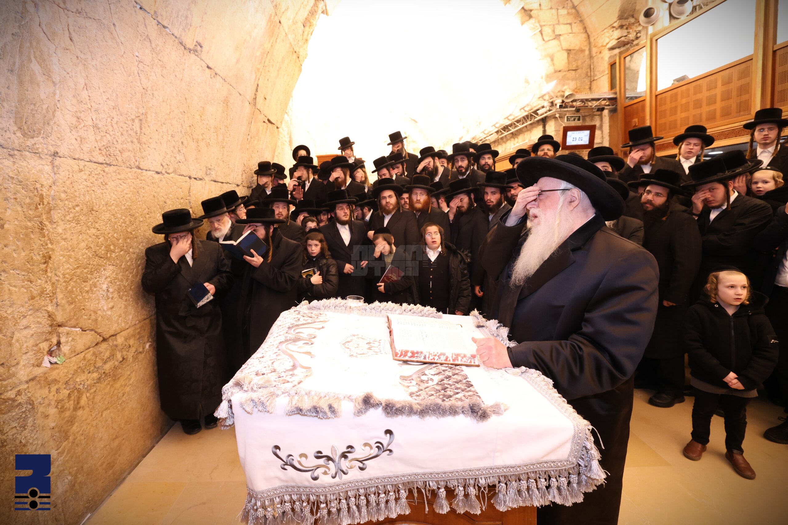 אנקומענדיג מול מקום המקדש האט די רבי שליט"א געריסן קריעה כדין, דערנאך האט מען זיך געשטעלט דאווענען מעריב וואו דער רבי שליט"א האט לאנג מאריך געוועהן מיט בכיות. נאך מעריב האט דער רבי געליינט קוויטלעך פון עטליכע אידן המצפים לישועה און פארלאזט דעם כותל. פון דארט איז מען ארויסגעפארן קיין אתרא קדישא מירון ווי באזונדער באריכטעט.