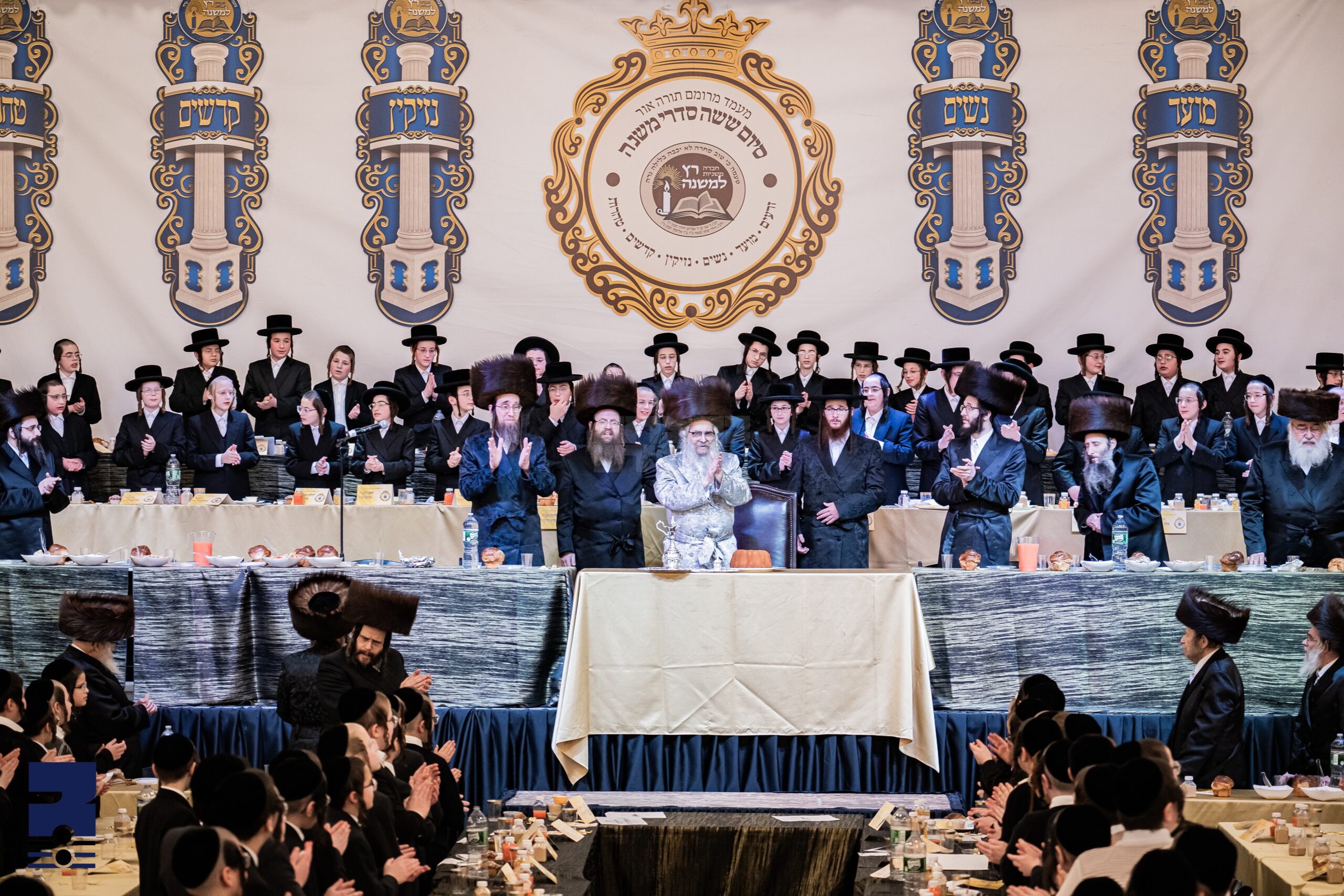 הונדערטער ילדי תינוקת של בית רבן אין די מוסדות הקדושים אין קרית יואל האבן דעם מוצאי שבת געפייערט די גראנדיעזע מעמד סיום ששה סדרי משנה דורך 'מתמידים רץ למשנה' וואס איז אפגעראכטן געווארן ברוב פאר והדר אין די בית רחל אודיטאריום 'בנין לאה אסתר', בראשות כ"ק אדמו"ר מסאטמאר שליט"א.