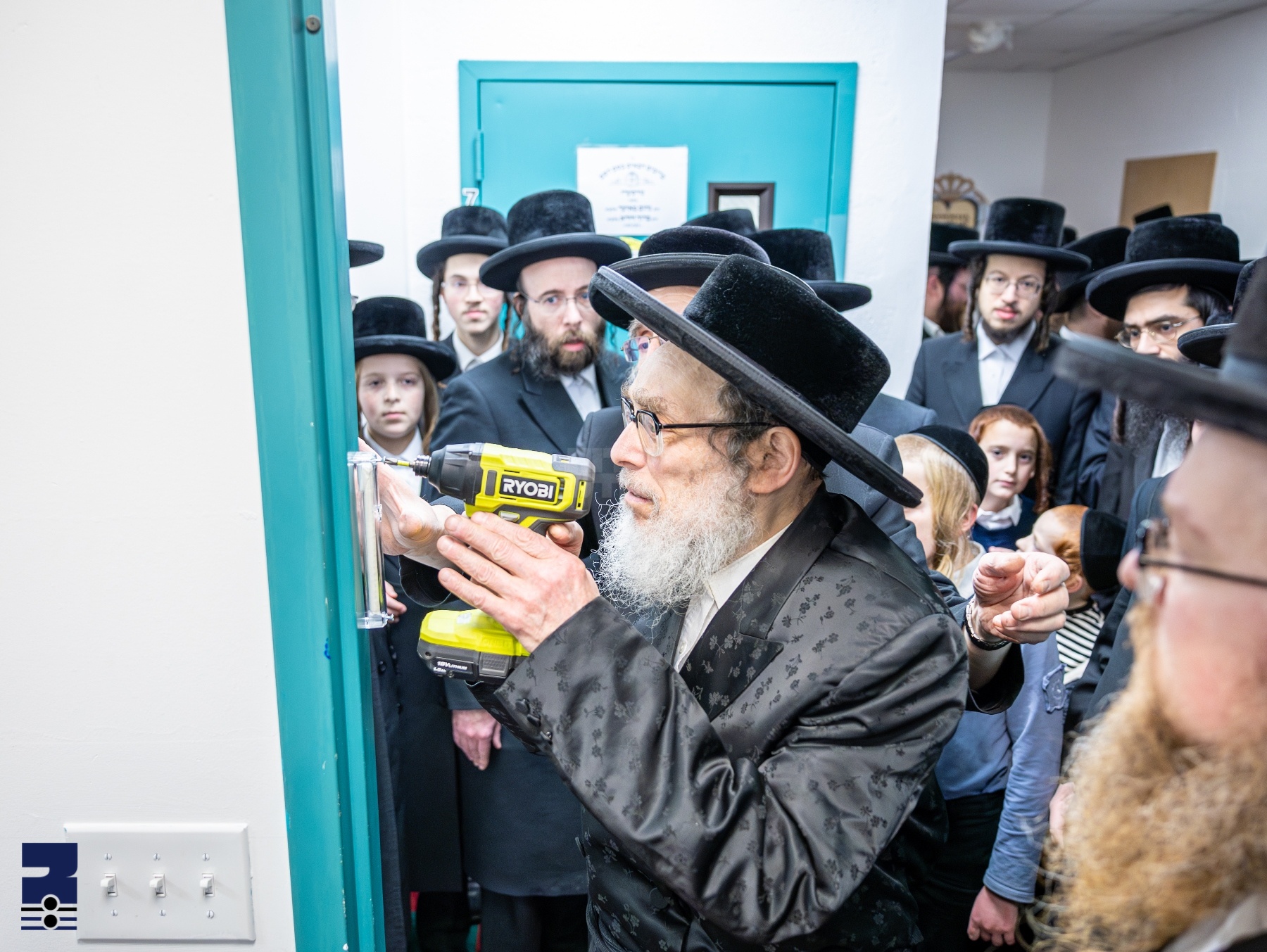דער בנין איז פראכטפול אהערגעשטעלט מיט אלעס וואס פעלט זיך אויס פאר א פולשטענדיגע תלמוד תורה מיט אלע צוגעהערן. ביים אנקומען איז דער רבי שליט"א ארומגעגאנגען צווישן די קלאס ציממערן, וואו ער זיך ארומגעקוקט אויף די לימודים און דאן קובע געוועהן א מזוזה ביי איינע פון די קלאסן. מיט די איבעריגע מזוזות האט דער רבי מכבד געוועהן בנו הגדול הגה"צ רבי מאיר גרינוואלד דומ"ץ פאפא, הרה"ג ר' דוד לייב פישער מדייני הקהילה, הרה"צ ר' יעקב נפתלי ראטענבערג א זוהן פון כ"ק אדמו"ר מקאסאן שליט"א מייסד העיר, און נאך פון די חברי הנהלת המוסדות.