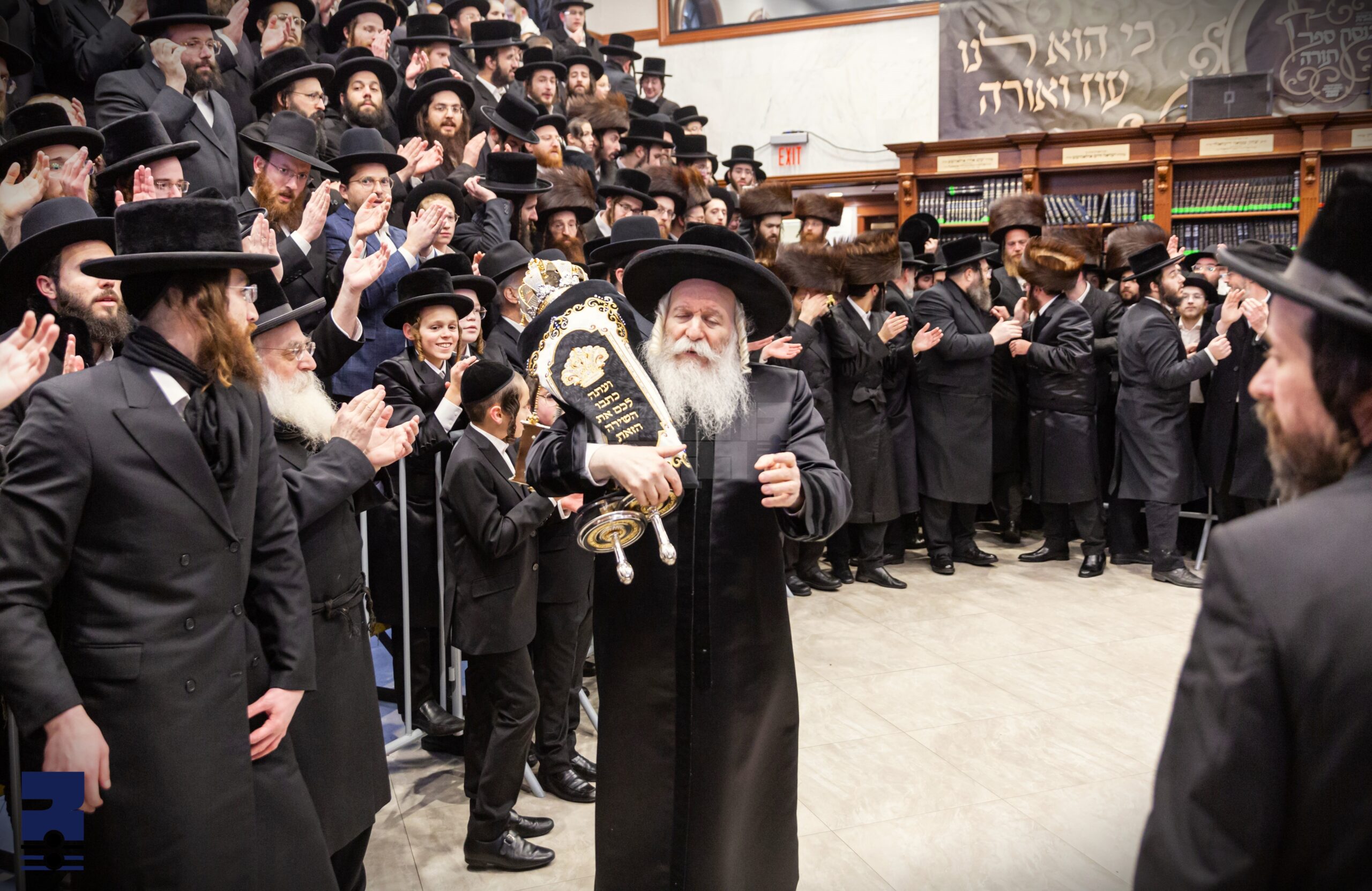 די רב שליט"א האט אריינגעפירט דעם ספר תורה אין ביהמ"ד וואס איז געווען אויסשטעלט מיט הויך שטאקיגע פארענטשעס פון ביידע זייטן מלא על כל גדותיו עד אפס מקום, צוליב די געדרענג אין ביהמ"ד האט מען אויפגעשטעלט א שאטער אין חצר פון ביהמ"ד פאר די צענדליגע קינדער און אידן וואס האבן נישט געקענט מיטהאלטן די מעמד אין ביהמ"ד צוליב די ריבוי עם.