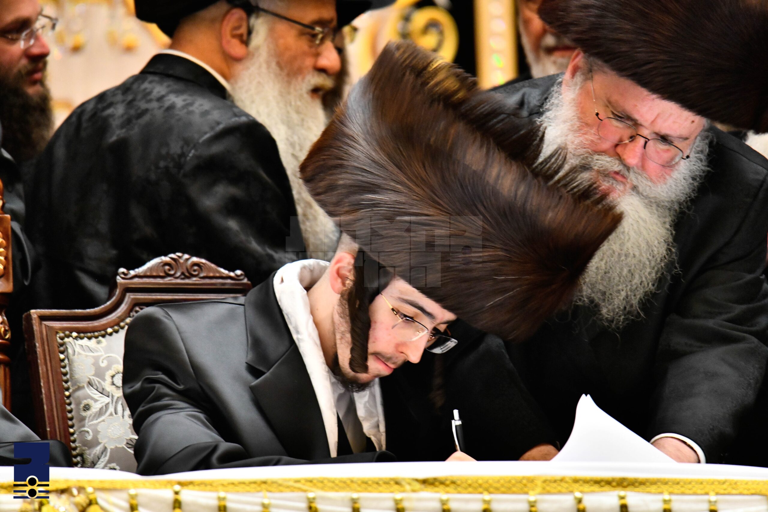 אום 4:30 זענען די אדמורי"ם שליט"א אינאיינעם מיט די אנדערע זיידעס און מחותנים ערשינען צום מעמד קבלת פנים, מען האט געזינגען ניגוני התעוררות, און כ"ק אדמו"ר מזידיטשוב מארין פארק שליט"א, א פעטער פון די חתן איז מכובד געווארן צו ליינען די תנאים.