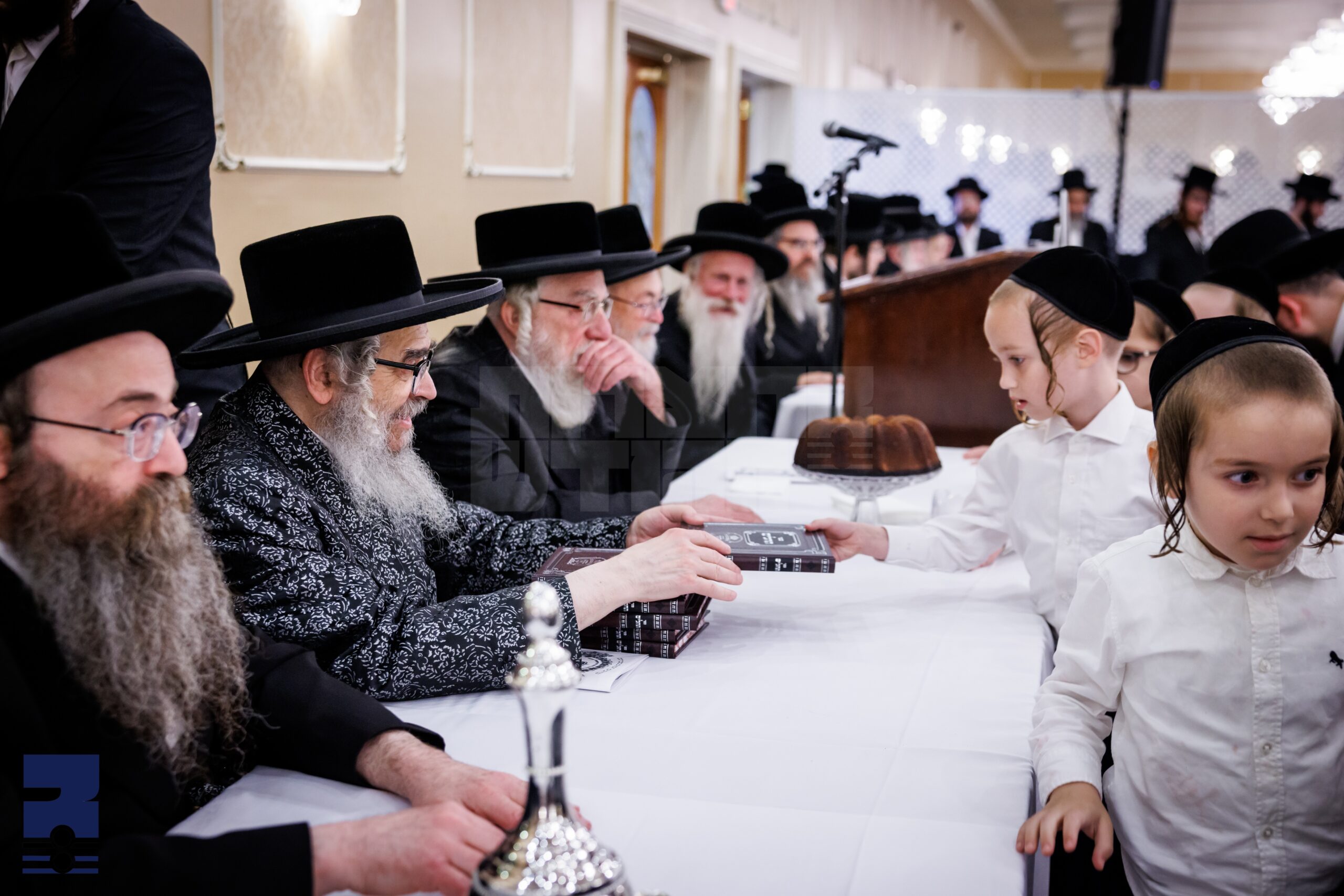 ביים אנקומען צום חומש סעודה האט זיך די רבי באגריסט מיט די חשובע רבנים אויפן אויבנאן און מיט הגה"צ רבי אברהם הערש וואזנער אבד"ק סאטמאר מאנסי , די קינדער האבן פארגעזינגען עטליכע ניגונים און חרוזים לכבוד המעמד, דערנאך זענען אלע קינדער אריבער און דער רבי האט פארטיילט א תהילים פאר יעדעם באזונדער, און דער רבי האט משמיע געווען דברי ברכה פאר די קינדער און ארויסגעברענגט די חשיבות פון לערנען תורה בטהרה און מסיים געוועהן ברכות לרוב.