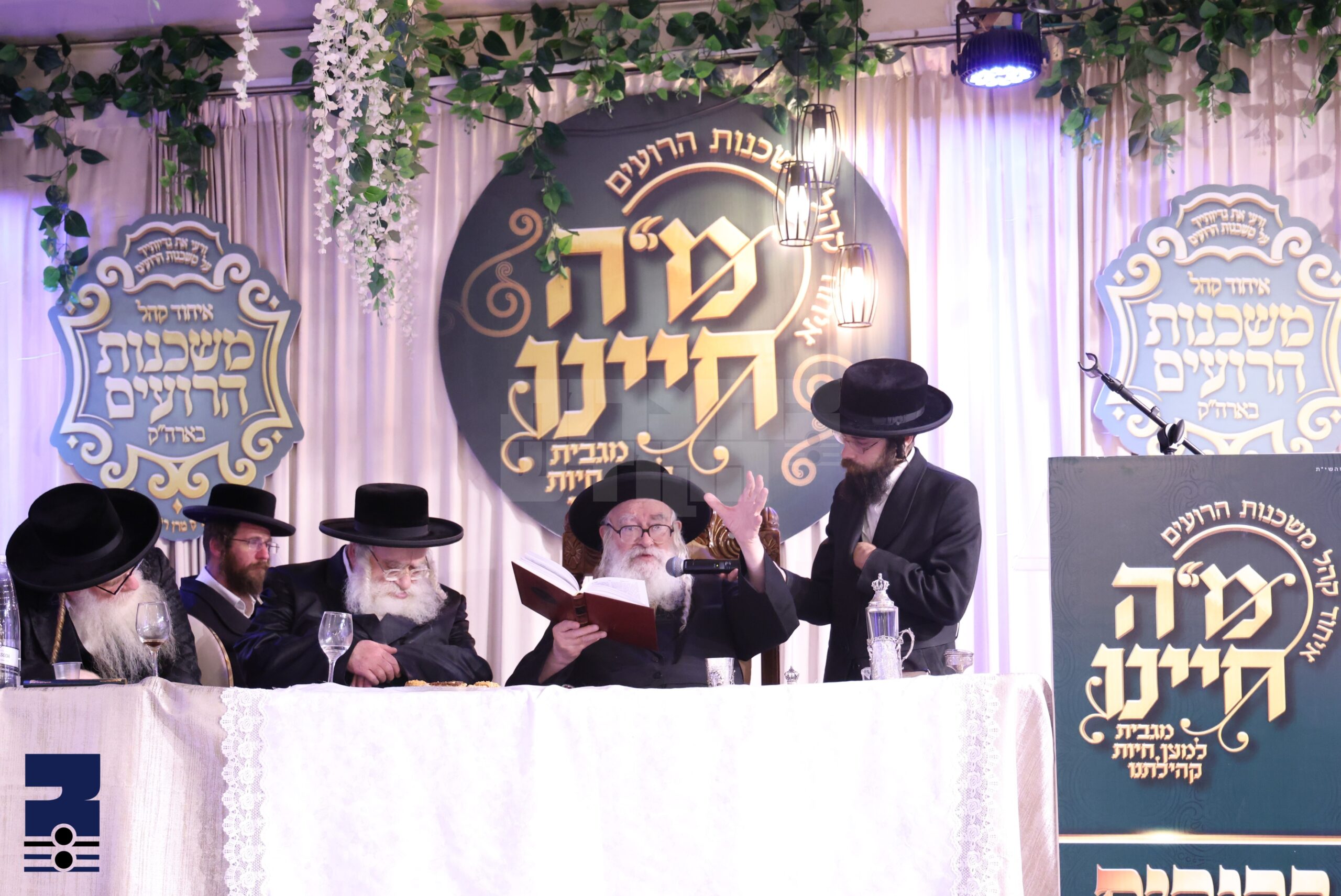 מיט א געוואלדיגע התרגשות האבן די פארזאמלטע זיך אויפגעשטעלט צו מקבל זיין פני קדשו פונעם מנהיג הקהילה דער רועה נאמן כ"ק אדמו"ר ממשכנות הרועים שליט"א וואס איז ספעציעל געקומען זיך משתתף זיין בטירחא דגברא רבא צו מחזק זיין די בני הקהילה וואס נעמען זיך אונטער דעם שותפות בהחזקת הקהילה.