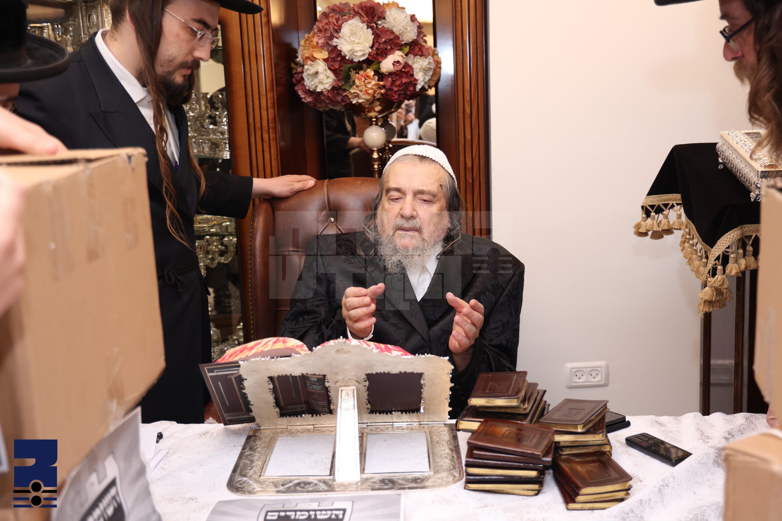 דאן האבן די עסקנים איבערגעגעבן פאר'ן רב שליט"א אַ גרויסע סכום פון ספּעציעלע תהלימ'לעך, געדרוקט אין אַ לעדערנע טייערע פארמאט, צו שענקן פאר די חשובע תומכים האדירים וועלכע באַשטייערן מיט גרעסערע סכומים צו קענען אָנגיין מיט די הייליגע פּעולות פון השומרים, מיט אַ קענטיגע שטאַרקע התרגשות האָט דער רב שליט"א פאר אַ לענגערע צייט געוואונטשן די תהלימ'לעך גאָר הייליגע און געהויבענע ברכות פאַר אַלע תורמים וועלכע וועלן ערהאַלטן די דאָזיגע תהלימ'לעך.