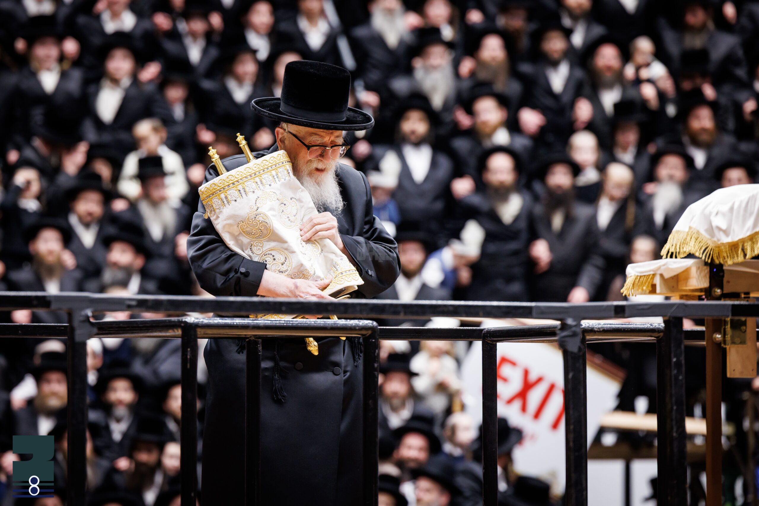 עליונים ששו ותחתונים עלזו, אשרי עין ראתה בשמחת קהלה קדושה סקווירא, רבבות חסידים מכל פינות העולם אנשים נשים וטף וואס האבן זוכה געווען מיטצולעבן בסילודי הוד די יום טוב'דיגע טעג פון שמחת התורה ביום חגיהם די לאנג ערווארטעטע היסטארישע חגיגה "הכנסת ספר תורה" וואס איז אריינגעגעבן געווארן בשותפות דורך כל קהלא קדישא הדין ומלכם בראשם דער רעיא מהימנא כ"ק אדמו"ר מסקווירא שליט"א.