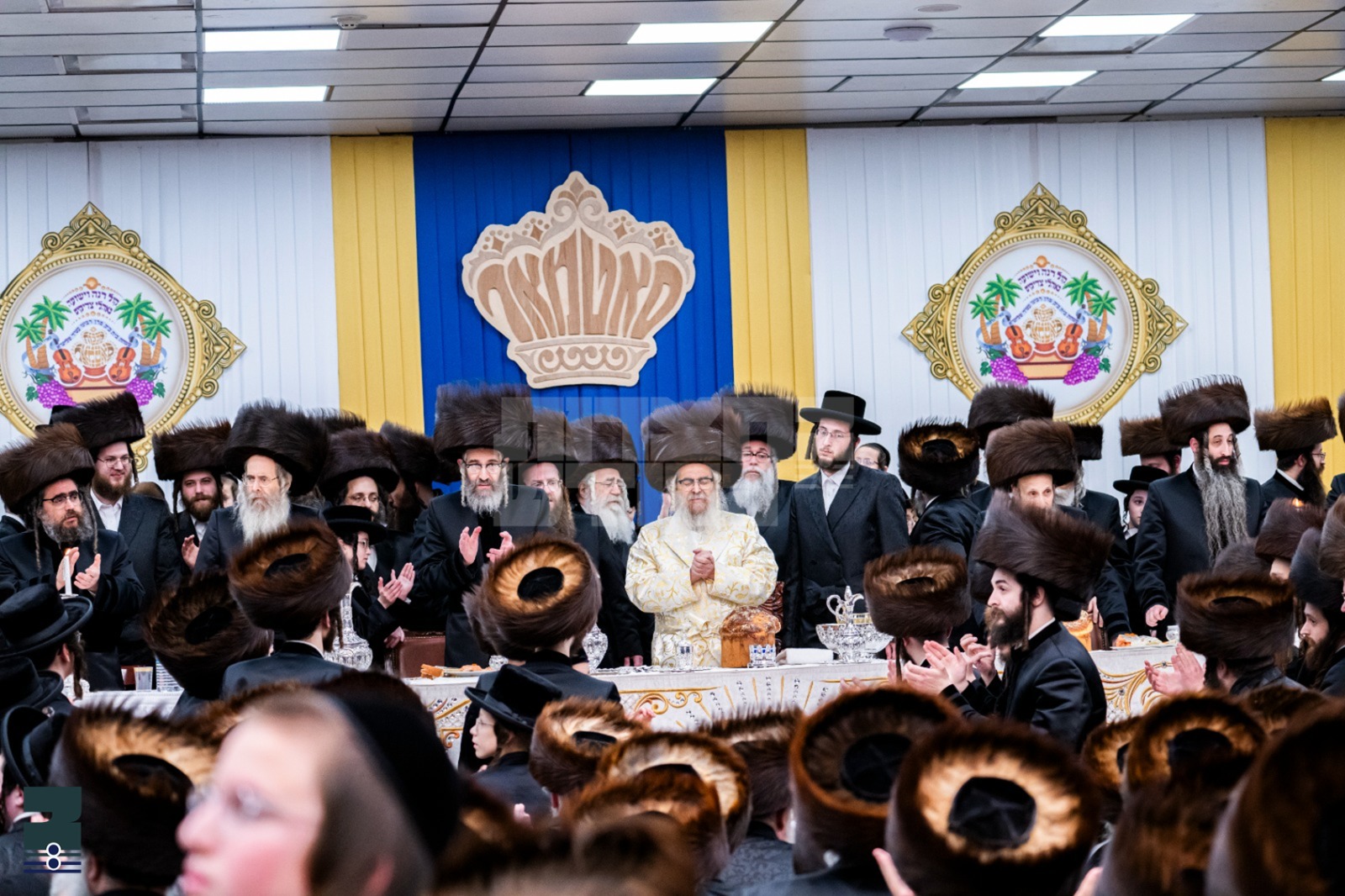 א קורצע צייט נאכן חופה איז דער רבי ערשינען צום סעודת החתונה אינעם ביהמ"ד הגדול, וואו דער ציבור לאלפים האט מקבל געוועהן פני קדשו בשירה וזמרה. די רבי איז געטאנצען עטליכע מינוט אויפן פלאץ און דערנאך זיך געוואשן צום סעודה, דאן איז דער חתן אריינגעקומען און דער רבי האט זיך אויפגעשטעלט אויף א ריקוד מיטן חתן א לענגערע צייט, און דערנאך מכבד געווען די זיידעס און די מחותנים הרבנים הגאונים שליט"א צו טאנצען מיטן חתן, דערנאך איז דער ציבור אריבער וואונטשן מזל טוב פארן רבי'ן. בשעת די ריקודין האט דער רבי פארלאזט די ביהמ"ד, אין איז צוריקגעקומען אין ביהמ"ד צום בענטשן, מיט ברכת המזון האט דער רבי מכבד געווען הגה"צ אבד"ק אויסטילא שליט"א, ברכות ראשונות: הגה"צ אב"ד סאטמאר 15טע עוו. שליט"א, אין ברכה אחריתא: הרה"צ רבי יקותיאל טייטלבוים שליט"א, א עלטער פעטער פון די חתן.