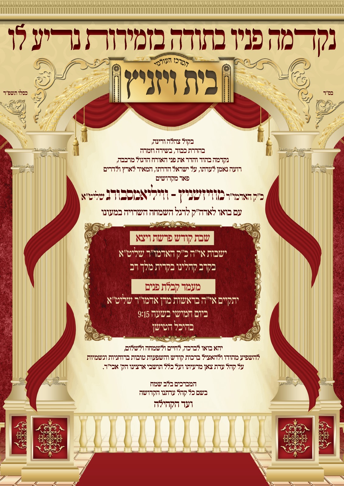 שבת פאר די חתונה שבת פרשת ויצא, וועט דער רבי ווי באריכטעט וויילן אין קרית ויזניץ בני ברק, במחיצת הקודש פון שאר בשרו מרן אדמו"ר מויזניץ שליט"א, ביידע רבי'ס וועלן פראווענען אינאיינעם די תפילות און טישן, און א ריזן ציבור פון געסט זענען ערווארטעט מיטצוהאלטן די היסטארישע שבת. דאנערשטאג נאכט וועט פארקומען א מעמד קבלת פנים לכבודו פונעם רבי'ן אין היכל ביהמ"ד הגדול אין קרית ויזניץ בני ברק, וואו דער רבי וועט משמיע זיין דברות קדשו לכבוד העם הנאספים.