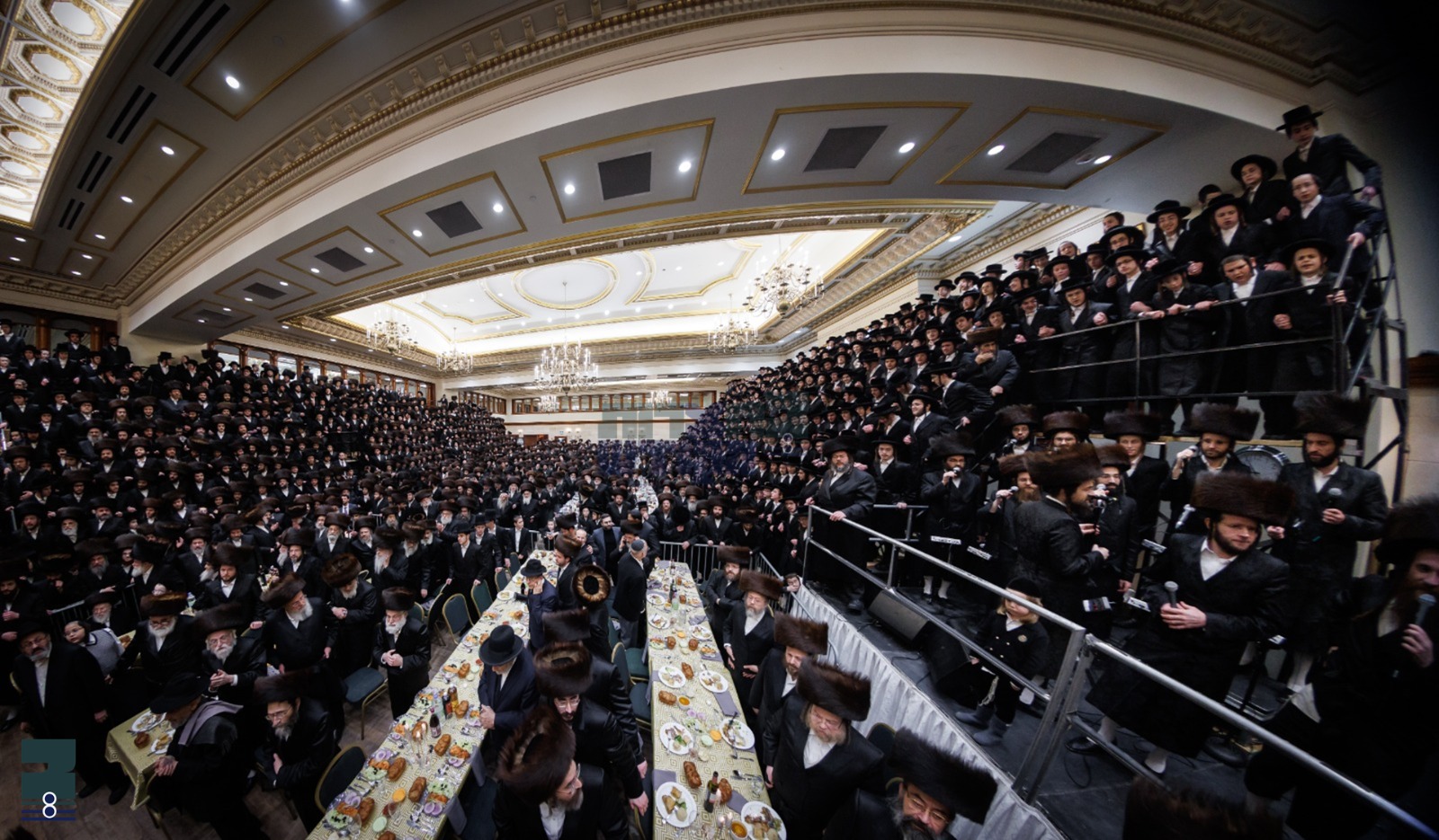 נאכן מעמד חופה איז די גאנצער עולם אריבער צום ביהמ"ד הגדול, וואו עס איז סערווירט געווארן די סעודת החתונה איינגעטיילט אין באזונדערע שטאקן, איש על מחנהו ואיש על דגלו, פאר עלטערע אידן ובני המשפחה בהיכל הביהמ"ד, עקסטער פאר אינגעלייט און בעלי בתים, עקסטער פאר בחורים, און פאר ילדי תשב"ר.