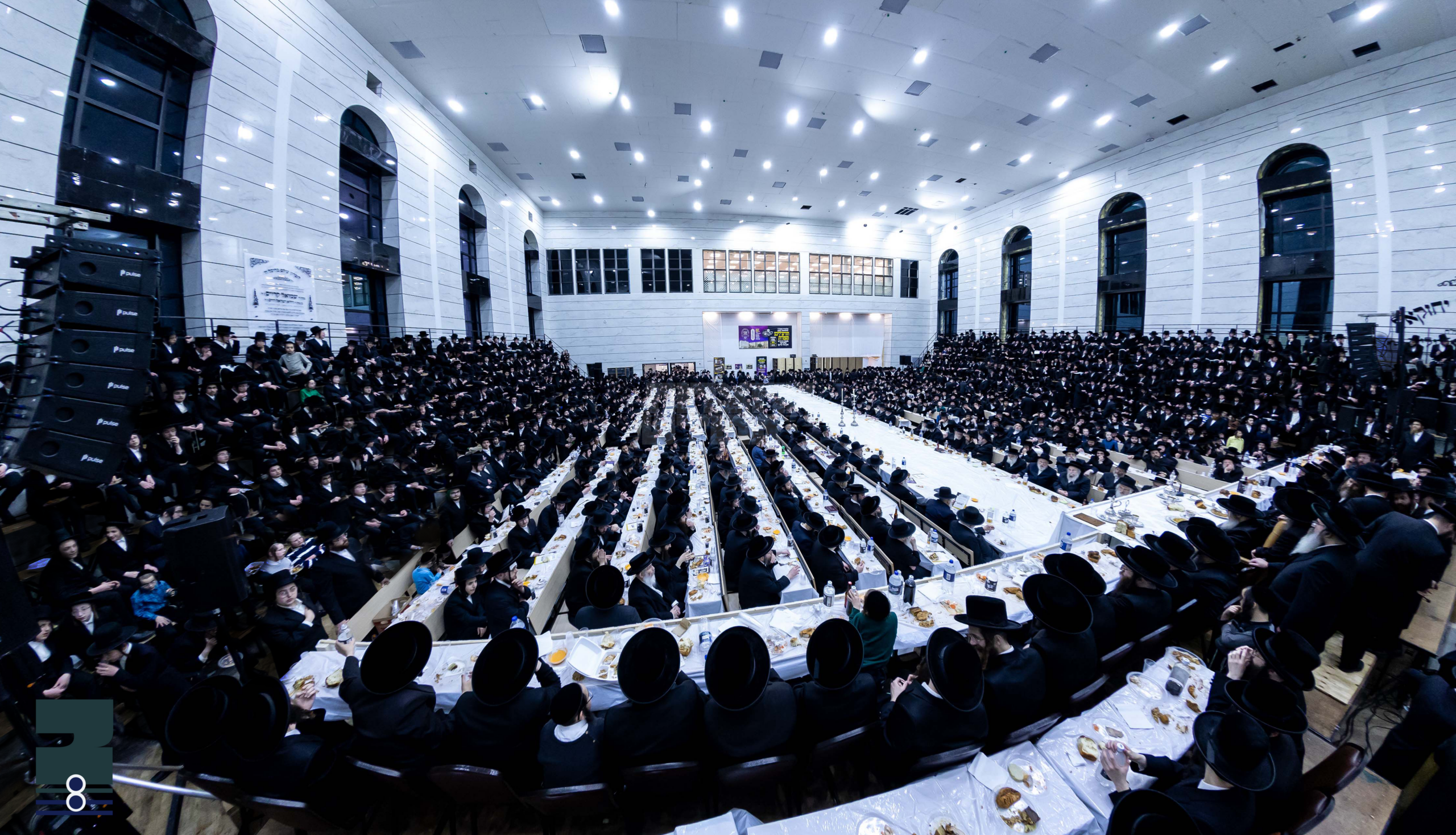 בשעה 8:00 איז די רבי שליט"א אריינגעקומען צום סעודת הילולא אין בית המדרש הגדול אין קרית יואל, וואס איז געווען איבערגעפילט מקצה אל הקצה, ענדלאזע רייעס מיט טישן, הויך שטאקיגע פארענטשעס פון ביידע זייטן, בהשתתפות פון פילע טויזענטער אידן, זקנים ונערים, בעלי בתים ואברכים, בחורי חמד, רבני ועיני העדה, כולם נקבצו באו. אזוי אויך האבן זיך משתתף געווען די קינדער פונעם בעל ההילולא זי"ע, הגה"צ אב"ד זענטא שליט"א, און הגה"צ גאב"ד סאטמאר מאנסי שליט"א.