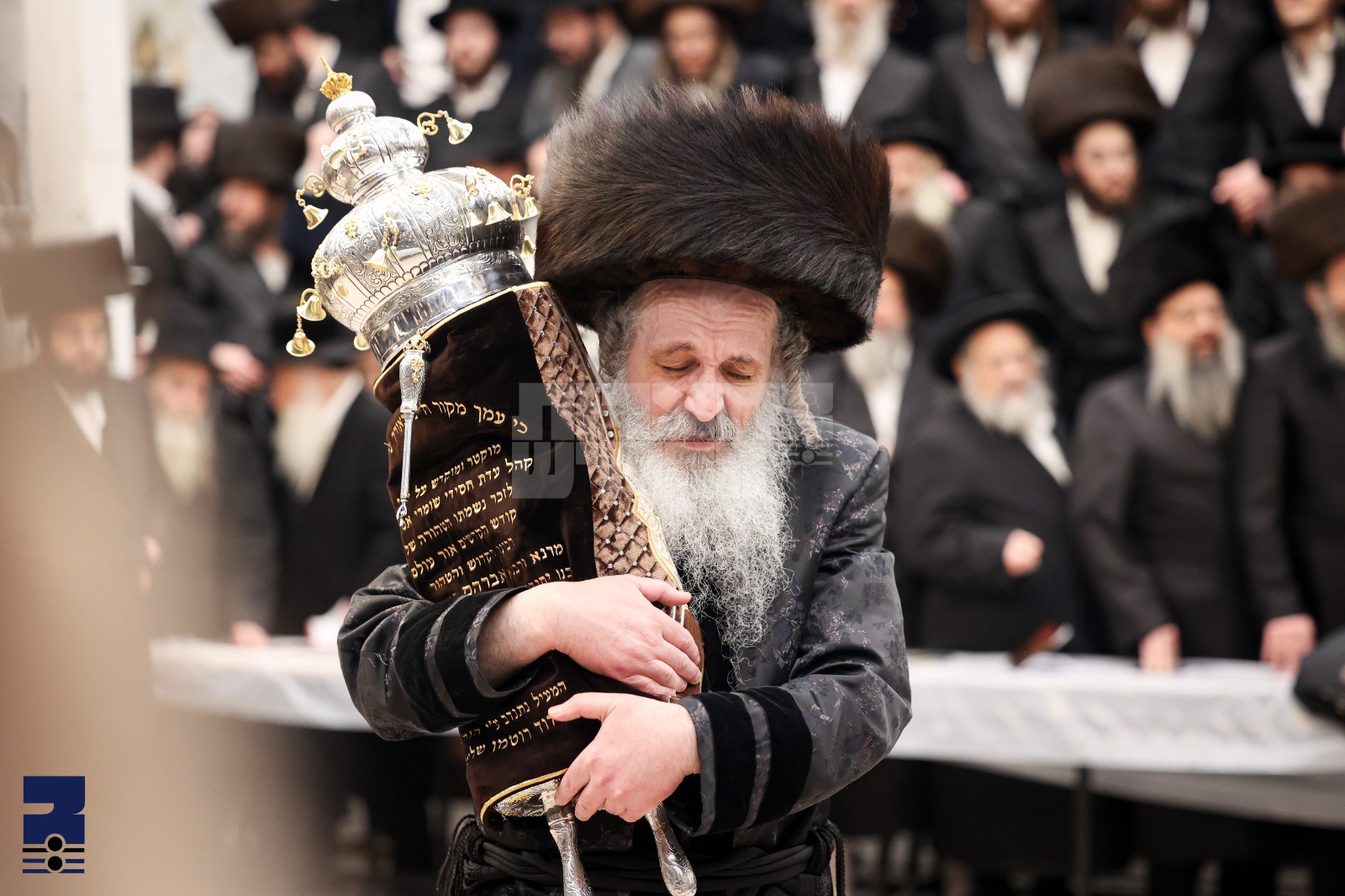דאנערשטאג אווענט איז די רבי שליט"א אנגעקומען צום שטוב פון הרה"ח ר' יהודה לייב אוירינג שליט"א מנהל מוסדות שומרי אמונים און פון דארט באגלייט די ספר תורה ברחובה של עיר ארומגענומען מיט פילע חסידים וואס האבן זיך מיטגעפרייט בשמחת התורה, אנקומעדיג צום חצר נעבן בית המדרש הגדול האט דער רבי שליט"א אפגערכטן די עבודת הקודש פון די הקפות איבער דריי פערטל שעה, און דערנאך זענען געטאנצן די איינקלעך פון דער בעל שמחה הרה"ק בעל חוקי חיים, זקני החסידים און נאך.