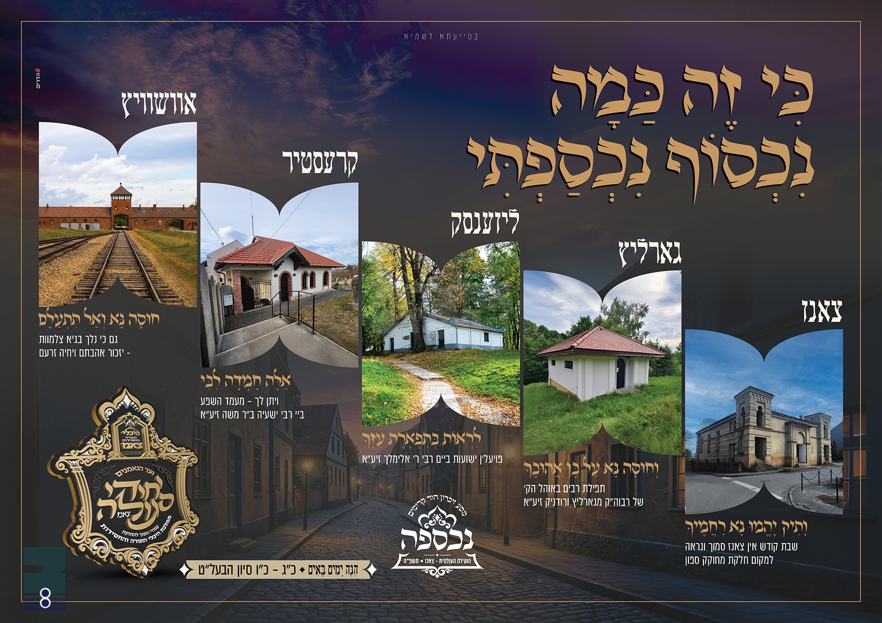 די נסיעה מיט'ן נאמען "נכספה" וועט זיך ארויסלאזן דעם קומענדיגן חודש סיון, און מ'וועט במשך די נסיעה אנקומען לקברי האבות אין די שטעט צאנז, גארליץ, ליזענסק, קערעסטיר, און צום לעצט וועט מען באזוכן אינעם עיר הדמים אוישוויץ, וואו מ'וועט מתפלל זיין ביים מקום המוקדה וואו מיליאנען אידן זענען פארגאזט געווארן על קידוש ה', ארץ אל תכבדי דמים און ס'וועט צוגלייך אויפגעברענגט ווערן די הימלישע יד ה' וואס האט געראטעוועט הרה"ק מצאנז קלויזנבורג זי"ע ממות לחיים, לפליטה גדולה והלחיות עם רב כיום הזה.