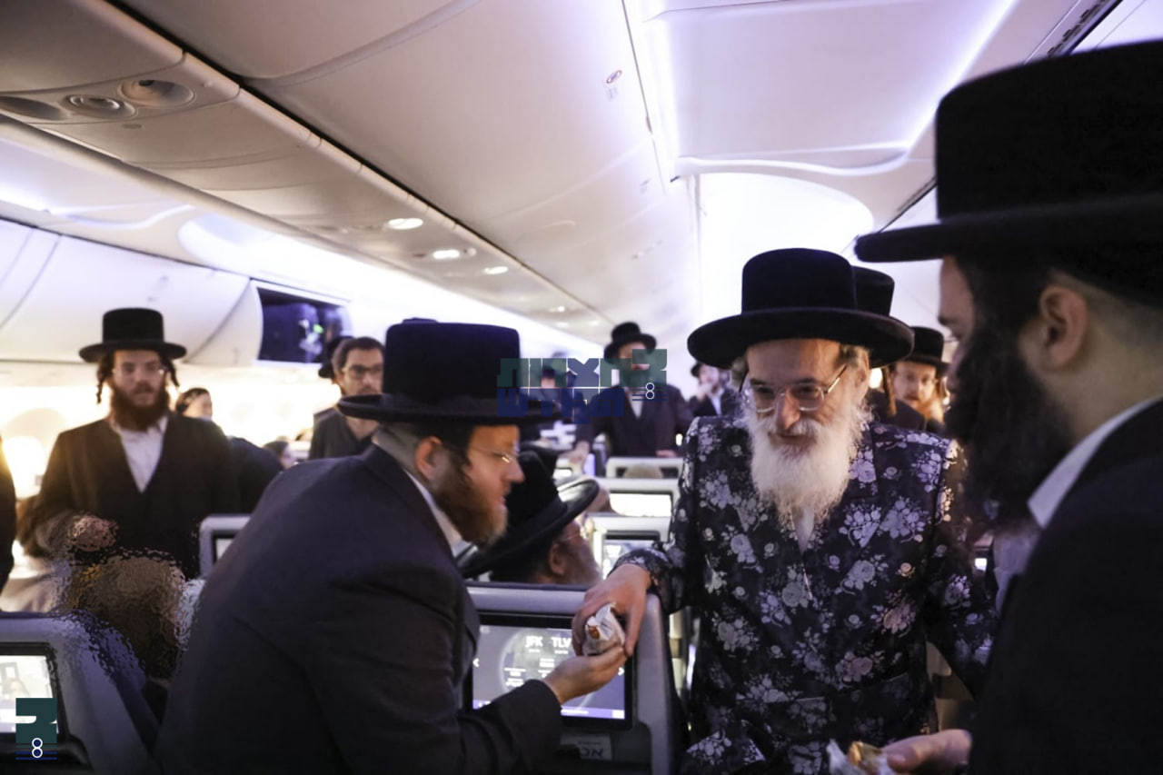אויפן פליגער האט דער רבי געפראוועט א לחיים מיט די מקורבים, דערנאך האט דער רבי זיך ארומגעדרייט אויפן פליגער, און פארטיילט מזונות פאר אלע אידישע רייזענדע. דער רבי האט געזאגט אז ער פארט צו א שמחה במעונו, דעריבער וויל ער וואונטשן יעדן פערזענליך מיט אלע ברכות.