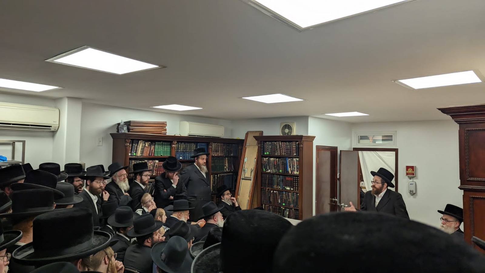 צום באשטימטן צייט האבן זיך פארזאמלט די פילע חברי הקהילה יונג און אלט מיטצוהאלטן דעם געהויבענעם מעמד בקודש פנימה, מען האט געזינגען ניגוני התעוררות און די רבי שליט"א האט געלייגט דעם אבן הפינה און מען האט אויסגעבראכן מיט ניגוני שמחה, די רבי האט אנגעוואונטשן ברכת קדשו פארן רב הבית מדרש בנו חביבו הרה"צ ר' נחום און פאר אלע מתפללים, און דערנאך האבן די חסידים געהאט די געלעגנהייט אדורכצוגיין אל מול פני הקודש כבני מרון.