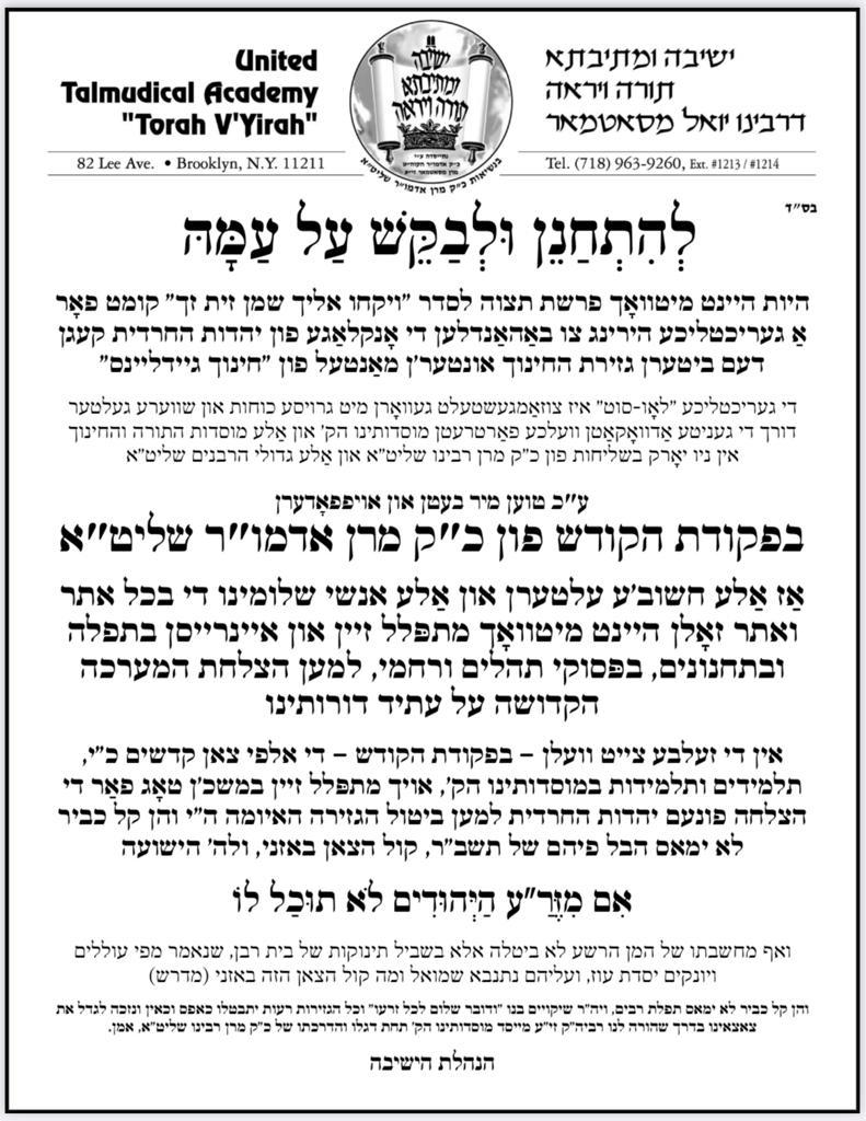 קול בחצרות – על פי פקודת הקודש פון כ"ק האד' מסאטמאר שליט"א מהרי"י איז היינט אויסגערופן געווארן אין אלע מוסדות התורה והחינוך א יום תפילה לביטול הגזירה אין ליכט פון דער געריכטליכע הירינג וואס איז באשטימט געווארן אויף היינטיגן מיטוואך צו באהאנדלען די אנקלאגע פונעם יהדות החרדית אין ניו יארק קעגן דעם ביטערן גזירת החינוך