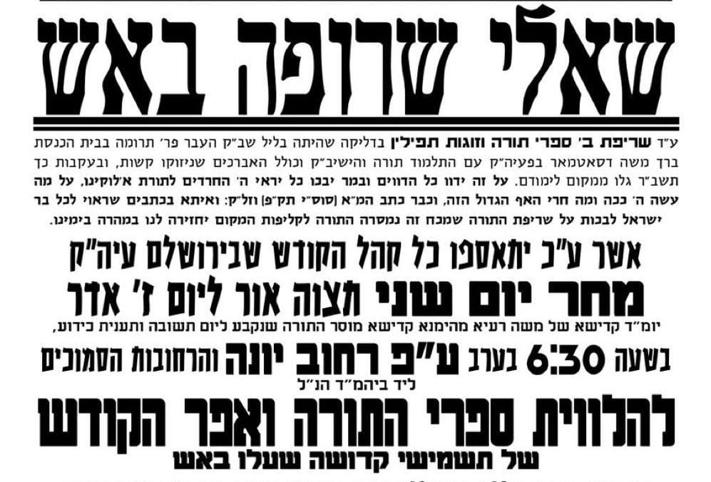 הויפט בלאט באריכט שאלי שרופה באש • לווית פון ספרי תורה באשטימט געווארן אויף מארגן ז' אדר
