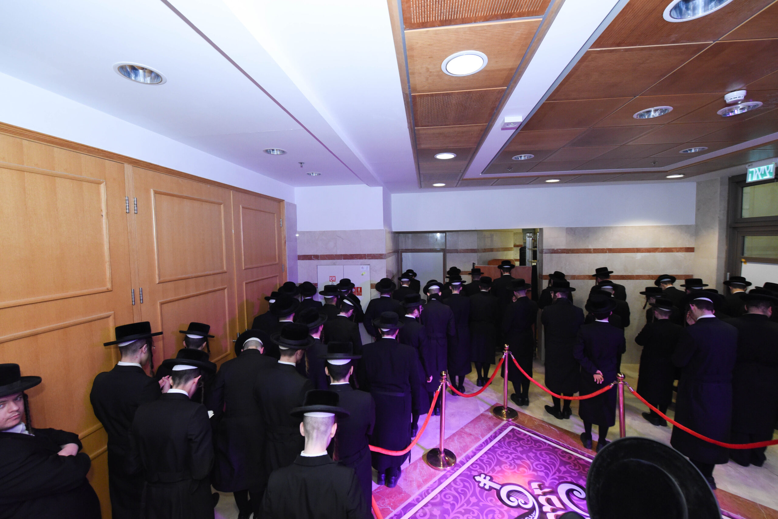 ביים מעמד האבן זיך באטייליגט נאנט צו דרייצן הונדערט בחורים פון די ישיבות דושינסקיא, תולדות אהרן, תולדות אברהם יצחק, סאטמאר, רמ"א, ברסלב, כנסת אליהו און בית הלוי. אויפן אויבן-אן האבן זיך אנגעזען די צענדליגע ראשי ישיבות, מנהלים, משגיחים און כלי קודש, צווישן זיי: הגה"צ ר' משה קאהן ר"י תולדות אהרן, הגה"צ ר' אהרן שמואל דושינסקיא ראש הישיבות דושינסקיא, הגאון הגדול ר' פנחס ברויער ר"י כנסת אליהו אין הגאון הגדול ר' יעקב קליינער ר"י בית הלוי צו דער זייט פון הרבנים הגאונים וועלכע זענען נתמנה געווארן אלז רבני הוועד יזמרו לשמך ה"ה הגאון ר' יצחק רוזנבלט מרבני חסידי ברסלב, הגאון ר' עזריאל שלום גולדשטיין מרבני ק"ק סאטמאר, הגאון ר' אליעזר נייהויז מרבני ק"ק דושינסקיא, אין הגאון ר' ברוך היימליך מרבני ק"ק תולדות אהרן.