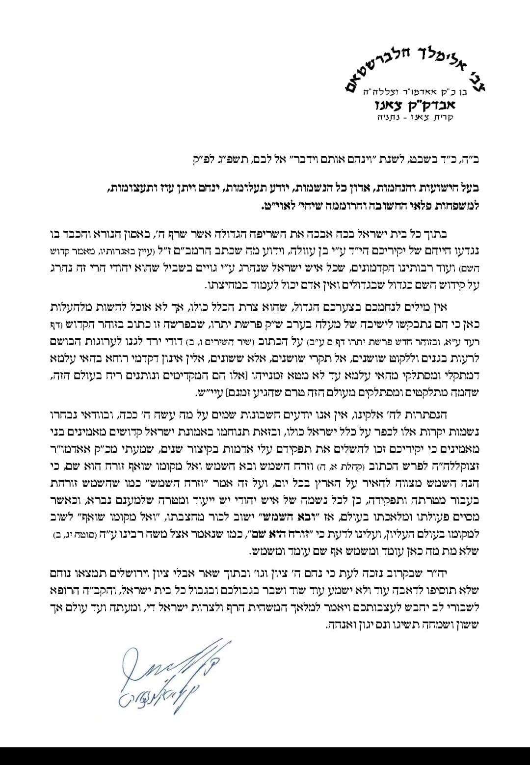 באריכט מכתב תמנחומים פון האד' מצאנז צו די פלאי משפחה געשריבן דורך admin123 פברואר 17, 2023 פברואר 17, 2023 ינואר 15, 2026 בוקמארק 2 גאב''ד צאנז י-ם בוקמארק הנה מלכך בא: חסידי צאנז אין אמעריקע ציילן שוין די... ינואר 13, 2026 בוקמארק אסיפה נחוצה במעונו פון האד' מצאנז איבער ווייטערדיגע שריט צו... ינואר 12, 2026 בוקמארק שיינעם מסיבת שבע ברכות אין אכסניא פון גאב"ד קרית צאנז... ינואר 9, 2026 ווידיאו • האד' מצאנז קלויזענבורג באשיינט שמחת השבע ברכות פון... ינואר 6, 2026 בוקמארק שיינע חתונה פון נכד הרה"ק מצאנז קלויזנבורג זי"ע פארגעקומען אין... ינואר 5, 2026 בוקמארק חסידי צאנז ציילן די טעג צום ביקור מרומם פון האד'... ינואר 5, 2026 ווידיאו • האד' מצאנז קלויזענבורג באשיינט ביים חתונה לנכד גיסו... ינואר 1, 2026 בוקמארק סימן טוב ומזל טוב: שידוך געשלאסן בחצרות צאנז – דזיקוב... ינואר 1, 2026 בוקמארק בורא רפואות: פלאנירער פון נייע אידישע שפיטאל אין לעיקוואד באזוכן... דצמבר 25, 2025 בוקמארק שיינער שידוך געשלאסן בחצר צאנז – מאקאווא – דזיקוב וויזניץ... דצמבר 18, 2025 שרייבט א קאמענט ביטול
