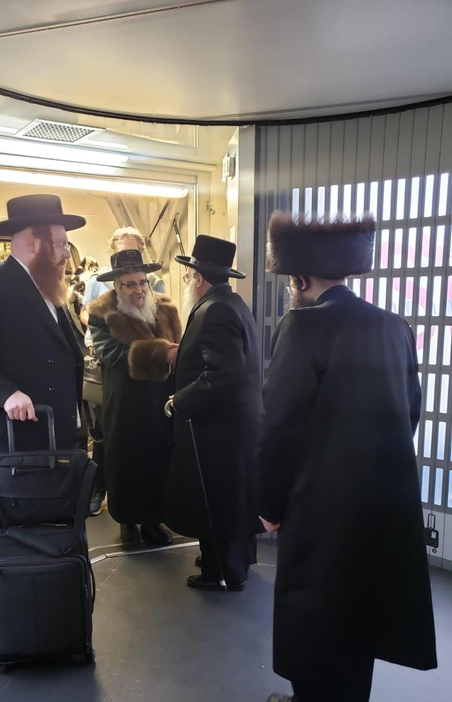 קול בחצרות – כ"ק האד' מסאטמאר שליט"א ביים אראפשטייגן פונעם פליגער, ווי ביים טיר פון פליגער האבן אפגעווארט דעם רבי'ן, הגה"צ רבי אברהם יונה שווארץ גאב"ד וויען עסטרייך, אינאיינעם מיט הרבני הנגיד ר' חיים לעווי הי"ו בבגדי שבת