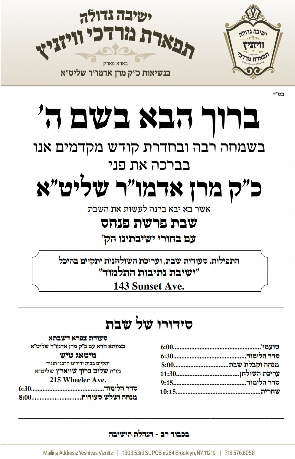 גאר א דערהויבענע שבת איז אריבער ביי בחורי ישיבה גדולה 'תפארת מרדכי וויזשניץ-ב"פ', ווען דעם שב"ק האבן די בחורים געהאט די זכיה מיטצולעבן דעם גאנצן שבת במחיצת כ"ק אדמו"ר מוויזשניץ-ב"פ שליט"א וועלכע איז אנגעקומען צוגאסט אין סטעטן-איילענד לעשות את השבת מיט די בחורי הישיבה. די חסידים וועלכע וואוינען אין ב"פ האבן נישט מוותר געווען צו פארפאסן אזא געהויבענעם שבת בצלא דמהימנותא און צענדליגע געסט פון איבער גרעיטער ניו יורק זענען געקומען קיין סטעטן-איילענד מיטצוהאלטן דעם שבת. ביים טיש פרייטאג-צונאכט'ס האבן זיך באטייליגט פילע חסידים ואנשי מעשה וועלכע האבן זיך לעצטענס אריבערגעצויגן צו די נייע יושוב אין שפיץ פון די חסידישע רבנים ודיינים אין שטאט: סקווירא דיין, צוויי גור'ע דיינים, בעלזא דיין און נאך. די מיטאג-טיש האט דער רבי שליט"א אפגעראכטן אין שטוב פון הנגיד ר' שלום ברוך שווארץ הי"ו וועלכע האט בייגעשטייערט א גרעסערע סומע לטובת הישיבה. מוצאי שבת האט דער רבי שליט"א אפגעשטאט א באזוך ביים סקווירא'ן דיין און דערנאך איז פארגעקומען א 'מסיבת לחיים' אין שטוב פון הנגיד ר' דוד נאדלער הי"ו וועלכע האט בייגעשטייערט א גרעסערע סומע לטובת הישיבה. אין אנדערע נייעס גרייטן זיך די הנהלת הישיבה צו עפענען די צווייטע כתה פון די ישיבה גדולה, נאך א יאהר פון גרויס הצלחה ברוחניות ובגשמיות וועלכע דערקענט זיך ביי די חשובע בחורים תלמידי ישיבה גדולה ד'וויזשניץ-בארא פארק.