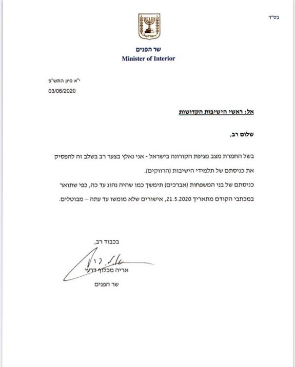 אין די צייט וואס ס'איז געווען א שטיקל האפענונג אז בחורים וואס וואוינען אין חו"ל און לערנען אין די ישיבות אין ארה"ק וועלן זיך קענען צוריקקערן קיין אר"י שוין דעם קומענדיגע וואך אין איינקלאנג פון פארשידענע תנאים, איז היינט געמאלדן געווארן דורך די באאמטע אין מדינת ישראל אז דערווייל וועט דאס נישט קענען צושטאנד קומען. אין א בריוו וואס דער שר הפנים ר' אריה דרעי האט היינט געשיקט צו אלע ראשי הישיבות בארה"ק שרייבט ער, אז צוליב א פרישע פארשפרייטונג אין ארה"ק, וועט מען דערווייל האלטן פארמאכט די גרעניצן און עס וועט נישט אריינגעלאזט קיין בחורים פון חו"ל וואס האבן נישט קיין איזרעילי בירגערשאפט. אין די לעצטערע וואכן האבן עסקנים אויסגעארבעט מיט די געזונהייט באאמטע אין מדינת ישראל אז תלמידים פון חו"ל זאלן זיך קענען צוריקקערן קיין אר"י און וועלן זיין איינגעשפארט פאר צוויי וואכן. די בעלזא ישיבה האט אפילו ארויסגעדינגען א האטעל אין שטאט ערד ווי עס איז צוגעגרייט געווארן אלע באדערפענישן פאר די חו"ל'דיגע בחורים ווען זיי וועלן זיך דארט אויפהאלטן אין לויף פון צוויי וואכן. למעשה זענען די פלענער פארוואסערט געווארן נאך די היינטיגע מעלדונג פון דרעי.