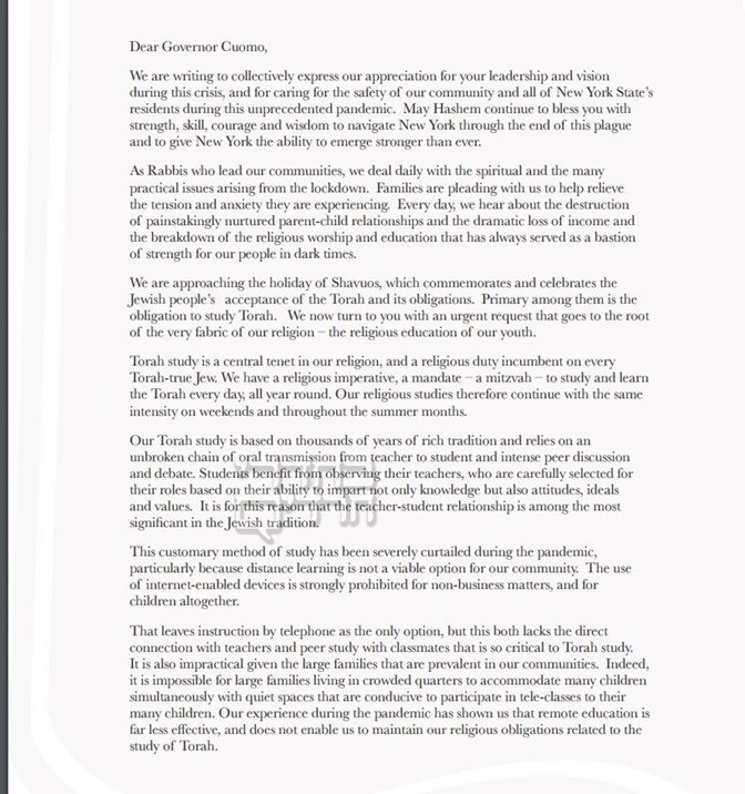 נאכדעם וואס גאווענער קאומא האט היינט געמאלדן אז דעי קעמפס וועלן זיך קענען עפענען פון דעם קומענדיגן ז' תמוז, ווערט אויפגעדעקט איבער א בריוו וועלכע איז געשריבן געווארן צום מעיאר דורך א רייע גדולי אדמורי"ם פארלאפענעם ערב שבועות. אינעם בריוו וועלכע איז אונטערגעחתמ'ט געווארן דורך האחים האדמורי"ם מסאטמאר, מונקאטש, וויזניץ-מאנסי, וויזניץ-וומסב"ג, פאפא, באבוב-45 און וויען שליט"א האבן די עיני העדה ערקלערט פאר'ן גאווענער איבער די וויכטיגקייט פון צוריק עפענען די בתי חינוך אויפן זוממער. אין אנדערע נייעס ווערט אויך אנדעקט אז די שארפע דעקלעראציע פון פרעזידענט טראמפ צוריק צו עפענען די בתי מדרשים, איז געקומען אין רעאקציע נאך א טעלעפאן-געשפרעך פון כ"ק אדמו"ר מסאטמאר שליט"א (מהר"א) מיט ווייסע הויז געהילפן.