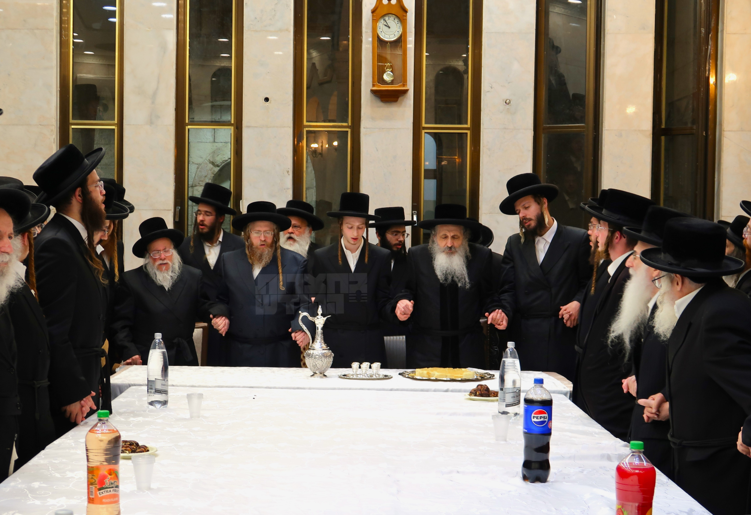 די גרויסע שמחת הווארט איז געפראוועט געווארן ברינה ובצהלה היינטיגן ליל שישי אין ביהמ"ד שומרי אמונים אין ירושלים, בהשתתפות פון די מחותנים האדמור"ים שליט"א, ווי א לענגערע צייט האט מען זיך משמח געווען בשמחת בית צדיקים און מען איז דורך וואונטשן מזל טוב.