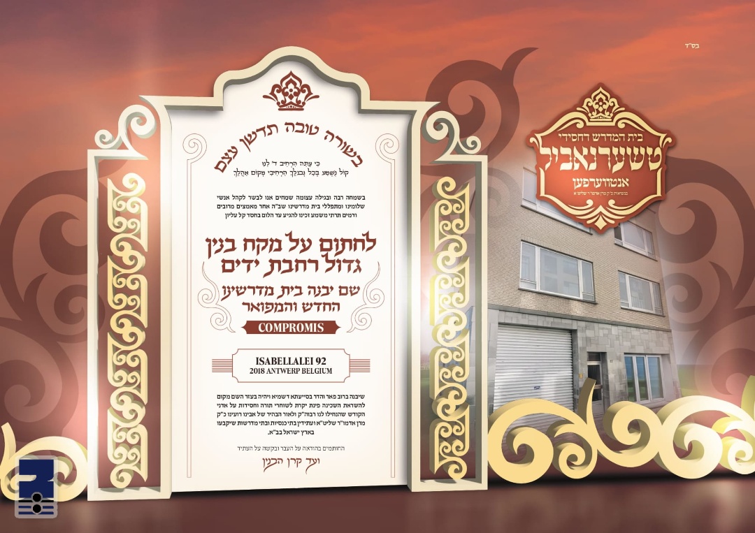 די טשערנאבילער בית המדרש אין אנטווערפען תחת דגלו והדרכתו פון כ"ק אדמו"ר מטשערנאביל שליט"א, איז אין די פאר יאר זינט איר התייסדות אויסגעשטיגן אלס א ריכטיגע חסידישע מקום תורה ותפילה פאר אינגעלייט און בעלי בתים, וואס האבן זיך קובע מקום געווען צווישן אירע פיר ווענט, אצינד ווען עס האט זיך אויסגעפעלט אונטערצונעמען א פרישע פראיעקט צו אוועקשטעלן דעם בית המדרש אין א אייגענעם לאקאל, האט מען אין א מזל'דיגע שעה אונטערגעשריבן קאנטראקט אפצוקויפן א גרויסע בנין אויף די איזאבעלאליי גאס אין הארץ פון שטאט. די מקח איז געשלאסן געווארן אין די טעג ארום ח' כסלו, ביומא דהילולא קדישא פון הרה"ק רבי אהרן מטשערנאביל זי"ע.
