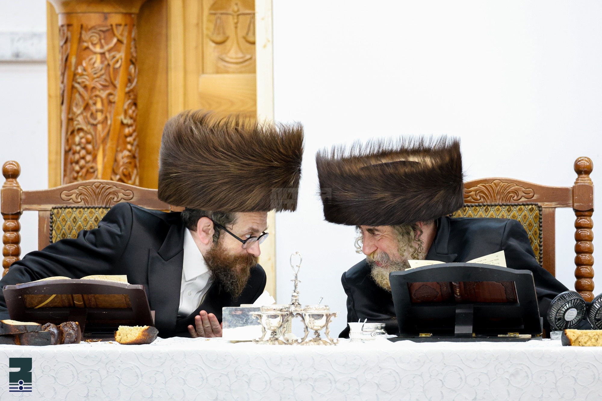 בשעתן טיש האט מען אויפגעגעבן די מאכלים פאר די דריי אדמורי"ם שליט"א צוגלייך, און דערנאך האט מען אויסגעמישט און פארטיילט שיריים פארן ציבור.