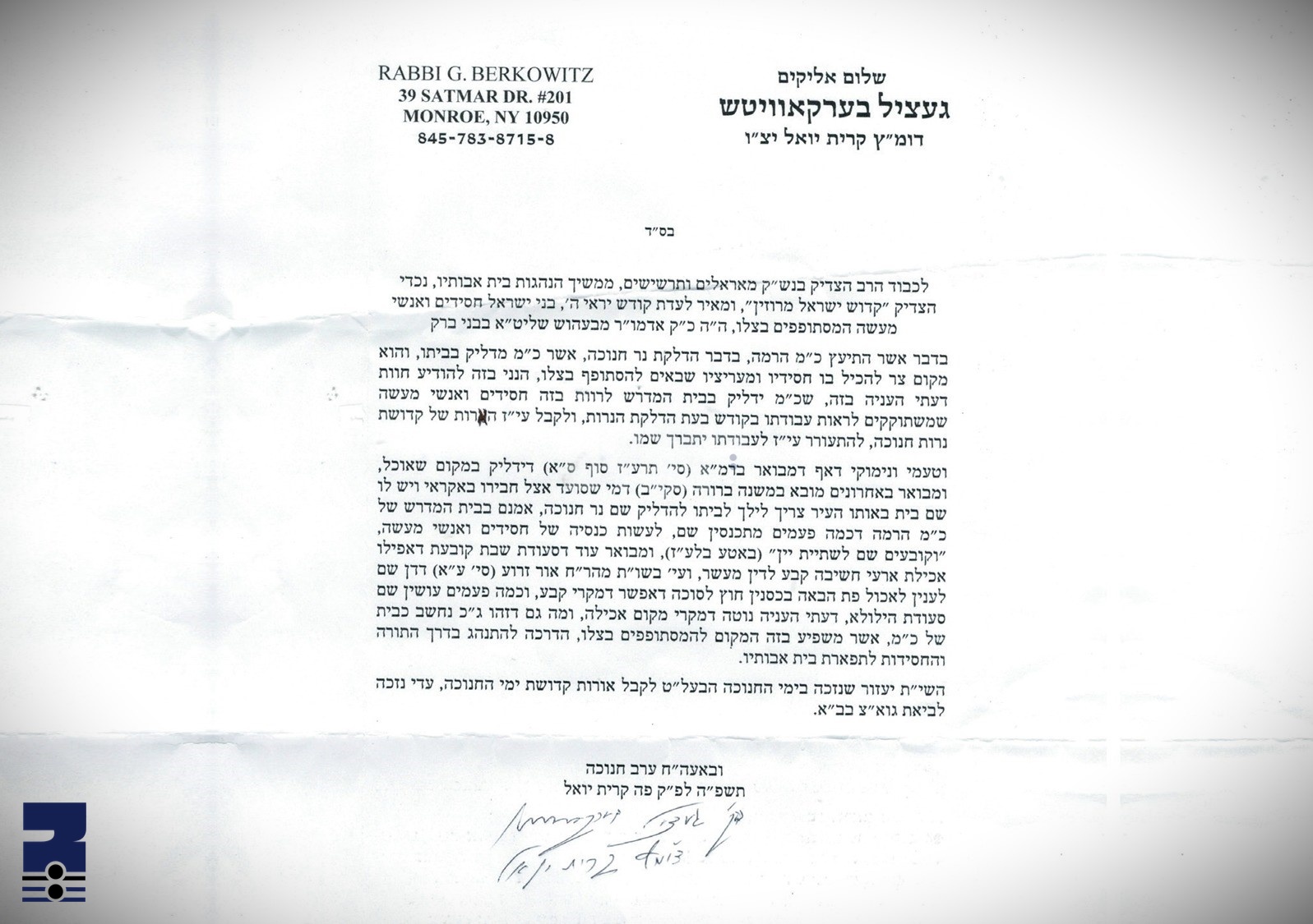ווי עס איז דער לשון פונעם דיין שליט"א אין די תשובה: "בדבר הדלקת נר חנוכה אשר כ"מ מדליק בביתו, והוא מקום צר להכיל בו חסידים ומעריציו שבאים להסתופף בצלו, הנני להודיע חוות דעתי העני' בזה שכ"מ ידליק בבית המדרש, לרוות בזה חסידים ואנשי מעשה שמשתוקקים לראות עבודתו בקודש בעת הדלקת הנרות" און ווי דער דיין שליט"א איז ממשיך נאָָכ'ן ברענגן די נימוקים בהלכה, ובלשונו: "ומה גם דזהו ג"כ נחשב כבית של כ"מ אשר משפּיע בזה המקום להמסתופפים בצלו, הדרכה להתנהג בדרך התורה והסידות לתפארת בית אבותיו".