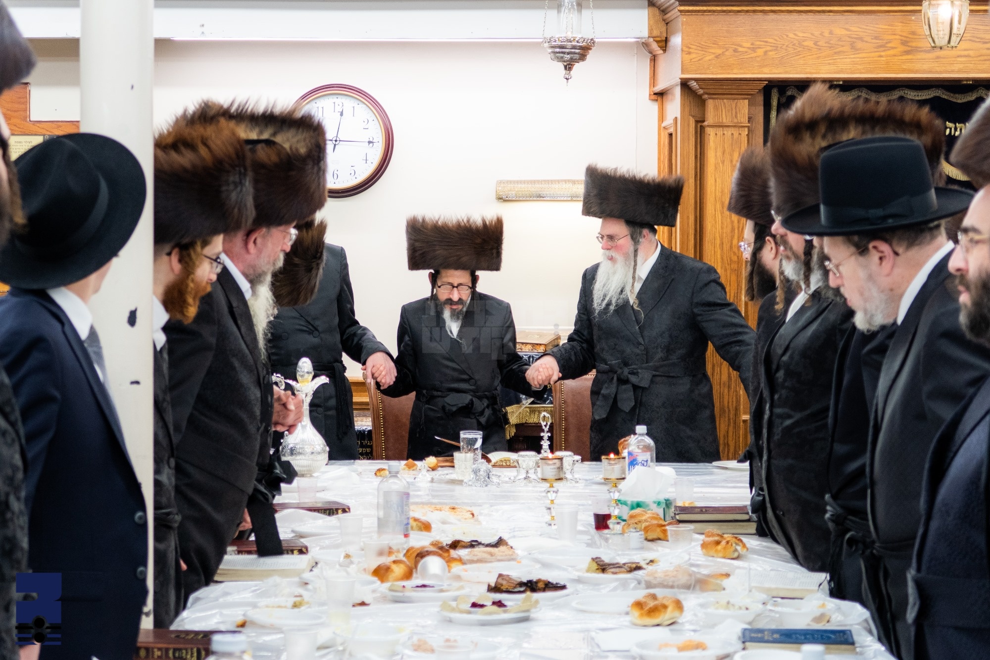 צום באשטימטן זמן איז דער רבי שליט"א ערשינען צום טיש, בשבת אחים גם יחד, אינאיינעם מיט'ן יונגערן ברודער כ"ק אדמו"ר מסקולען לינדען שליט"א, ומה נהדר היה המראה, ווען די צוויי ברודער זענען זיך מחבב זה את זה מיט א זעלטענע אהבה וריעות. נאכדעם וואס דער רבי שליט"א האט געמאכט קידוש, האט ער מכבד געווען האדמו"ר מסקולען לינדען אויך צו מאכן קידוש בקול רם, און אזוי ווייטער במשך דעם טיש האט דער רבי מקפיד געווען צו פראווען אלעס אינאיינעם, סיי ביים וואונטשן לחיים, און דערנאך ווייטער ביי די זמירות וניגוני קודש, זייענדיג מכבד דעם ברודער ביותרת הכבוד. שבת אינדערפרי נאכן דאווענען איז פארגעקומען די קידושא רבא לרגל די באווארפן פונעם חתן א זון פון הגה"צ ר' משולם פייוויש מאסקאוויטש שליט"א משאץ, נאנטער מקורב און מחותן פון אדמור"י בית סקולען, זון פון כ"ק אדמו"ר משאץ מאנטריאל זצ"ל, און איידעם ביי הגה"צ ר' משה יוסף מאסקאוויטש שליט"א משאץ ב"פ, וואו דער רבי האט באשיינט די שמחה.