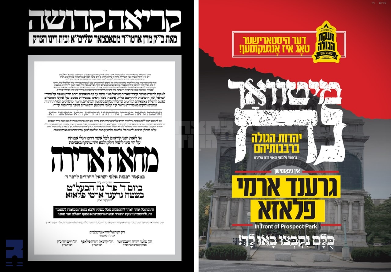 היינט ערשיינט א קול קורא אונטערגעשריבן דורך כ"ק אדמו"ר מסאטמאר שליט"א ובית דינו הצדק הגה"צ רבי שלמה יהודה וויינבערגער אב"ד פאיע, הגה"צ רבי זלמן לייב פילאפף אב"ד מכלל יופי און הגה"צ רבי חיים דוד כץ דומ"ץ סאטמאר בארא פארק, מיט א קריאה קדושה 'לכל אשר דרכו רגלי אבותיו על הר סיני' קומען אנטייל נעמען ביים ערשטמאליגע מחאה אדירה במעמד אלפי ישראל החרדים לדבר השם אויסצושרייען מסוף העולם ועד סופו א קול זעקה ומרה, כלשונם 'לחגור כלי מלחמה למחות ולהזעיק תבל ומלואה' קעגן די רשעי הציונים וואס זוכן רח"ל עוקר צו זיין די תורה הקדושה מיט'ן שענדליכן גזירת הגיוס.