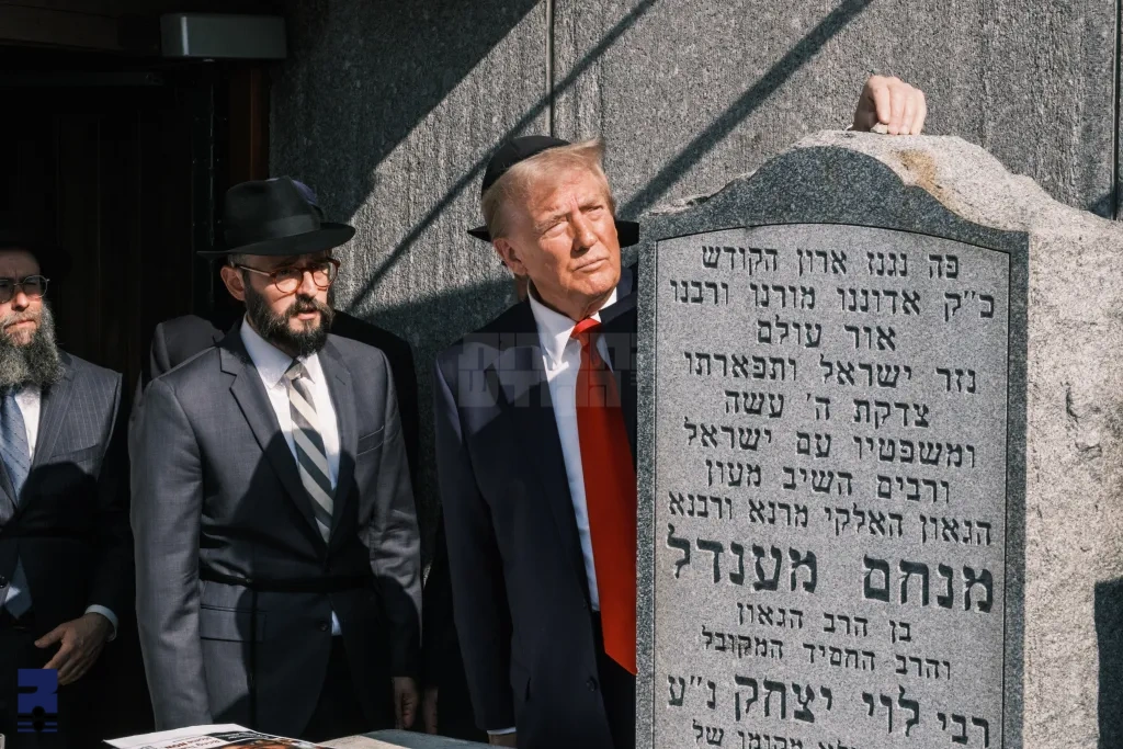 נאכ'ן פארברענגען ארום צוואנציג מינוט, אפרעכטנדיג א געבעט, געשריבן א קוויטל און געצינדן ליכט, איז דער פרעזידענט קאנדידאט ארויסבאגלייט פון בית החיים, ווערנדיג אפגעווארט און הילכיג באגריסט דורך א ריזיגער ציבור ליובאוויטשער חסידים וואס האבן חולק געווען כבוד למלכות מיט פלאקאטן וואס האט ארויסגערופן א באגריסנדע אקט פון קידוש ה', און טראמפ האט דערביי פארשפראכן צו שטיין צו די האנט פון די אידישע געמיינדע בכלליות, און בפרט פון חסידי חב"ד איבער די וועלט.