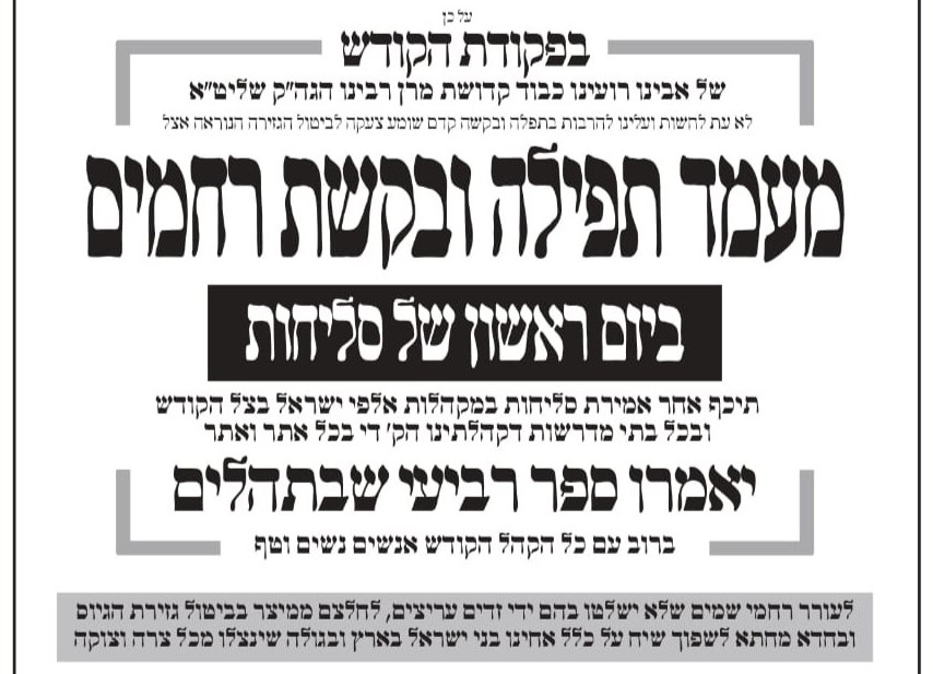 חסידי סאטמאר אלוועלטליך זענען איינגעהילט אין א התעוררות'דיגע הכנה צום קומענדיגן זונטאג א' סליחות, ווען ס'איז בפקודת הקודש פונעם מנהיג העדה כ"ק אדמו"ר מסאטמאר שליט"א באשטימט געווארן אויסצונוצן דעם יום מסוגל צו מתפלל זיין און איינרייסן רחמי שמים מרובים למען שלום אחינו שבארץ ישראל וואס ספראווען זיך מיט'ן ביטערן גזירת הגיוס, און איבער די שווערע גזירת החינוך אין ניו יארק.