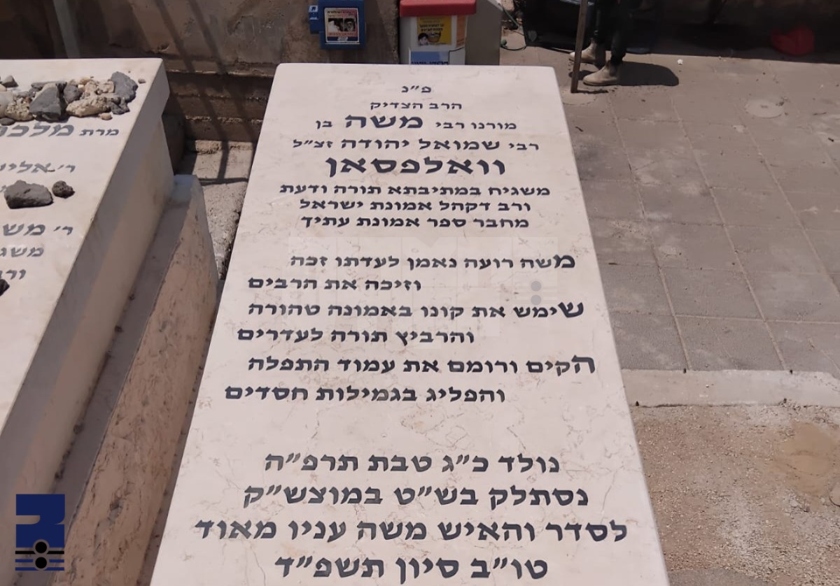 שטייענדיג ככלות השבעה להסתלקותו פונעם אומפארגעסליכן רועה נאמן און באליבטן משגיח מרן הגה"צ רבי משה וואלפסאן זצ"ל אב"ד אמונת ישראל ויתמו ימי בכי אבל משה, האבן זיך פילע תלמידים וחסידים דקהילת אמונת ישראל בארץ הקודש צונויפגענימען נעכטן זונטאג נאכמיטאג ביים אלטן בית החיים אין עיה"ק טבריה אשר שם חלקת מחוקק ספון וואו עס איז פארגעקומען די מעמד הקמת המציבה אויפן ציון פונעם משגיח נעבן מחברתו הטהורה די רעבעצין ע"ה סמוך ונראה למקום מנוחת קדשם פון די שרפי מעלה תלמידי הבעל שם טוב הקדוש זי"ע.