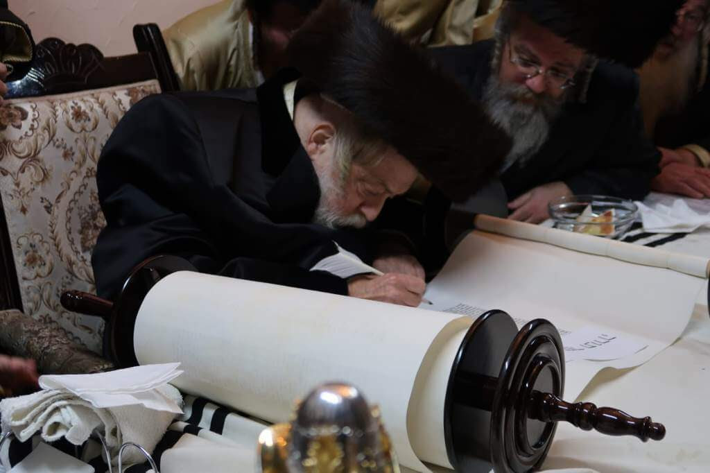 צוליב דעם וואס דער נדבן הספר תורה וואוינט אויף א העכערע שטאק, אין א בנין אן קיין עלעוועיטאר, האט מען אראפגעברענגט א גרויסער קרעין, מיט וואס די רבי איז ארויפגעפארן צום כתיבת האותיות בביתו פונעם נדבן. די רבי שליט"א האט באגלייט די תהלוכת הספר אין דערנאך אפגעראכטן די הקפת אין ביהמ"ד אין פארגעזאגט לדוד מזמור מיט גרויס התעוררות.