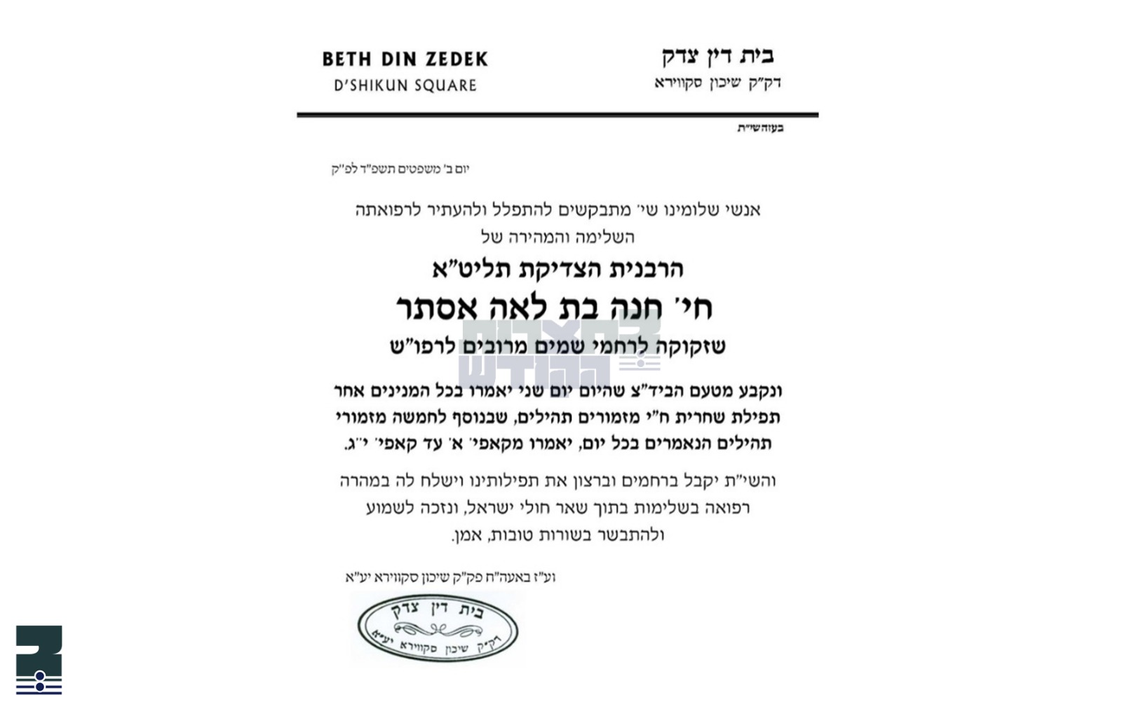 היינט איז דער 'בית דין צדק' דשיכון סקווירא ארויס מיט א רוף פאר חסידי סקווירא די בר אתר ואתר מתפלל צו זיין לרפואתה השלימה פון די רעבעצען וואס איז אנגעוויזן אויף גרויס רחמי שמים, היינט צופרי נאך שחרית וועט מען אין אלע סקווירא בתי מדרשים זאגן אכצן קאפיטלעך תהילים לרפואת הרבנית מרת חיה חנה בת לאה אסתר.