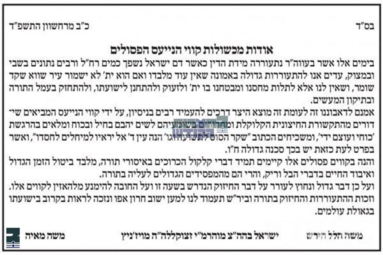 א שארפע בריוו איז נעכטן ערשינען דורך די גדולי הדור בארץ הקודש, וועלכע פארטרעטן בראש פון די וועד הרבנים לעניני תקשורת, וואו זיי טוען מעורר זיין דעם ציבור צו זיין אפגעהיטן פון הערן אלע סארט האטליינס למיניהם, איבערהויפט די האטליינס וואס ברענגען נישט כשר'ע נייעס און אפהאנדלונגען פון די אלגעמיינע טעלעוויזיע.