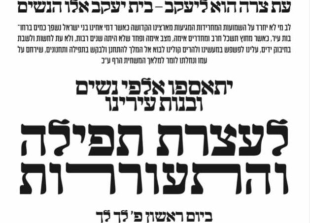נאכפאלגנדיג די היסטארישע עצרת תפילה והתעוררות פארלאפענעם וואך ברחובה של עיר בארא פארק אין ליכט פונעם מצב הנורא השורר בארצינו הקדושה, ווערט פאררופן נאך א גרויסארטיגע כינוס אויף דעם קומענדיגן זונטאג נאכמיטאג דאסמאל פאר טויזנטער נשות בארא פארק, די טויזענטער נשים צדקניות אין עלטערע מיידלעך, וואו מען וועט אינאיינעם מעורר זיין רחמי שמים מרובים פאר אחינו בני ישראל יושבי ארץ הקודש, אין די פילע געפאנגענער ל"ע הנתונים בצרה ובשביה.